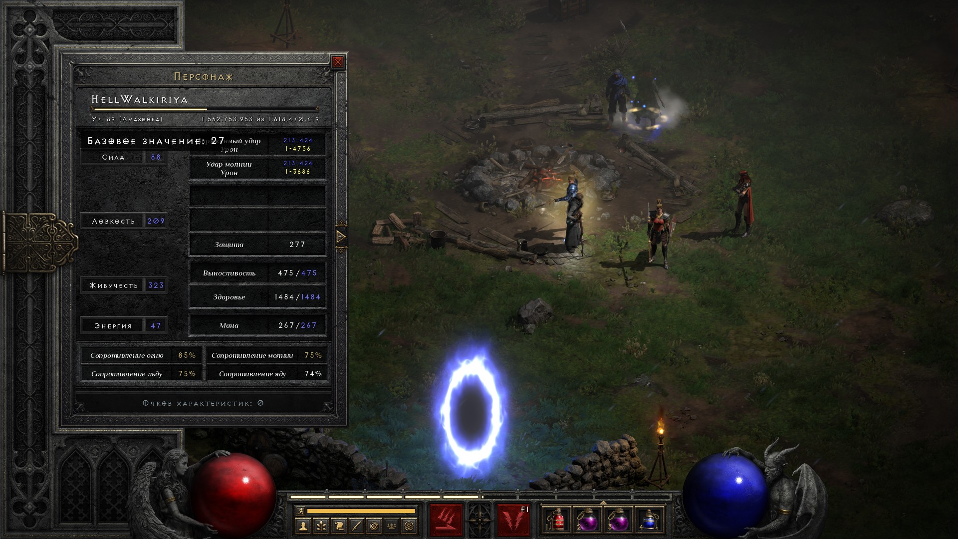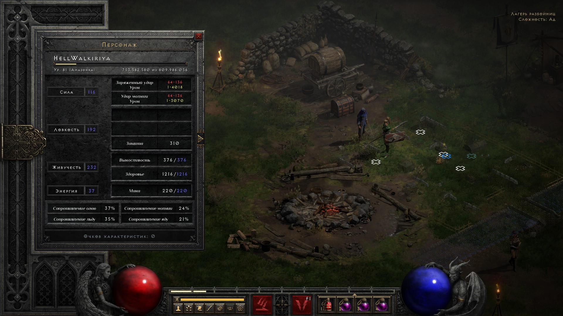 Сопротивления, разумеется, сильно просели. На аду персонаж получает еще -60% сопротивлений, в дополнение к -40% на кошмаре.