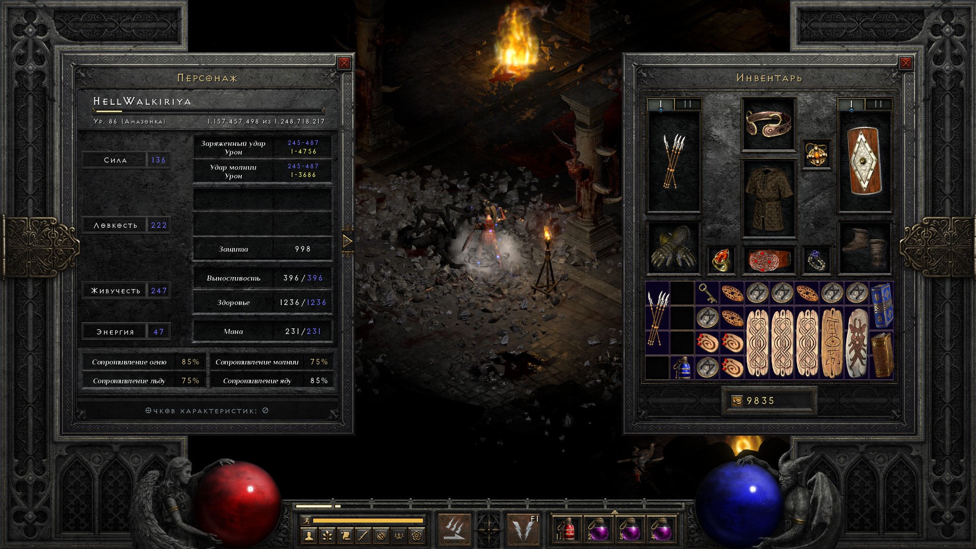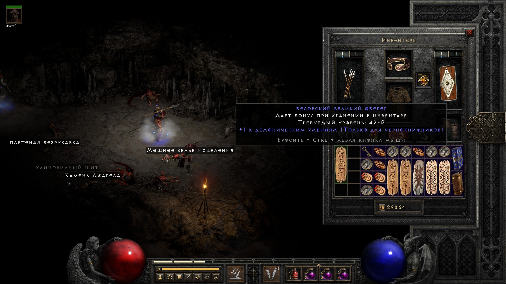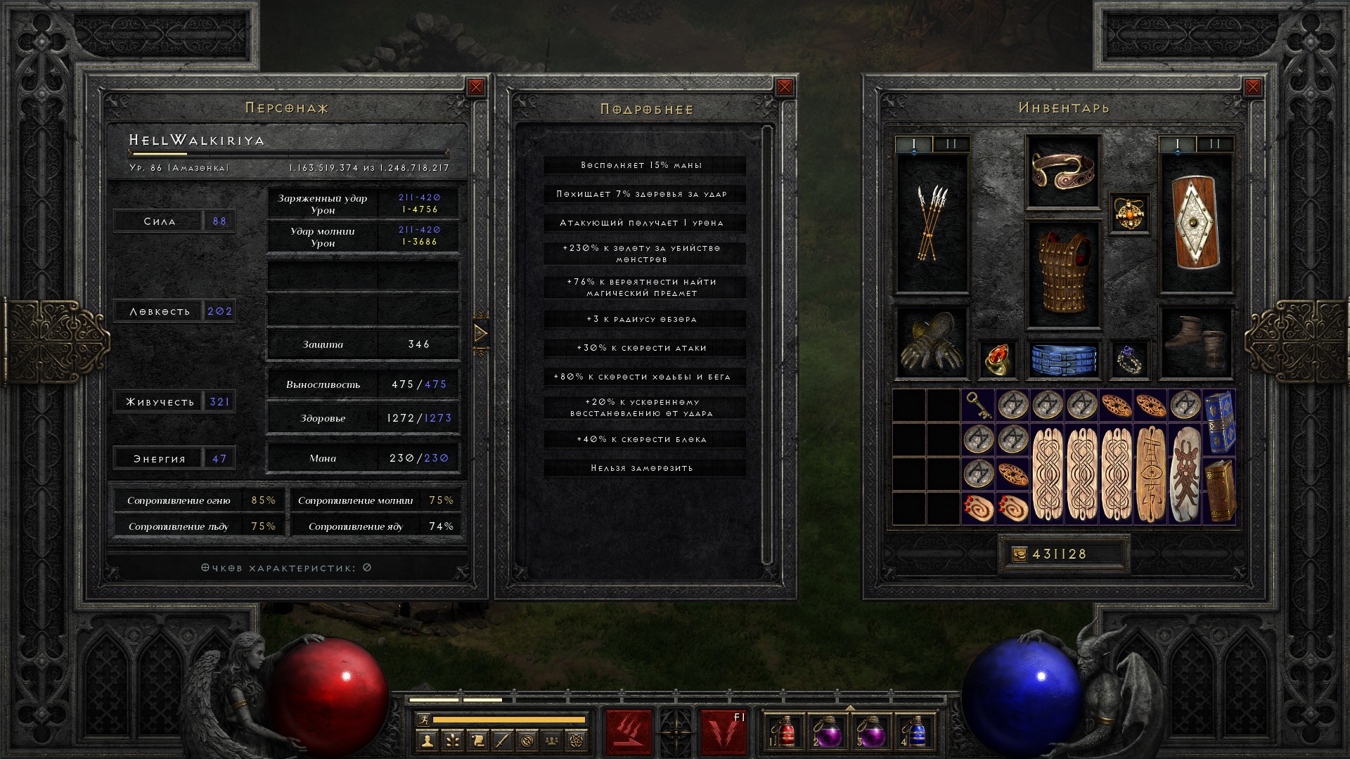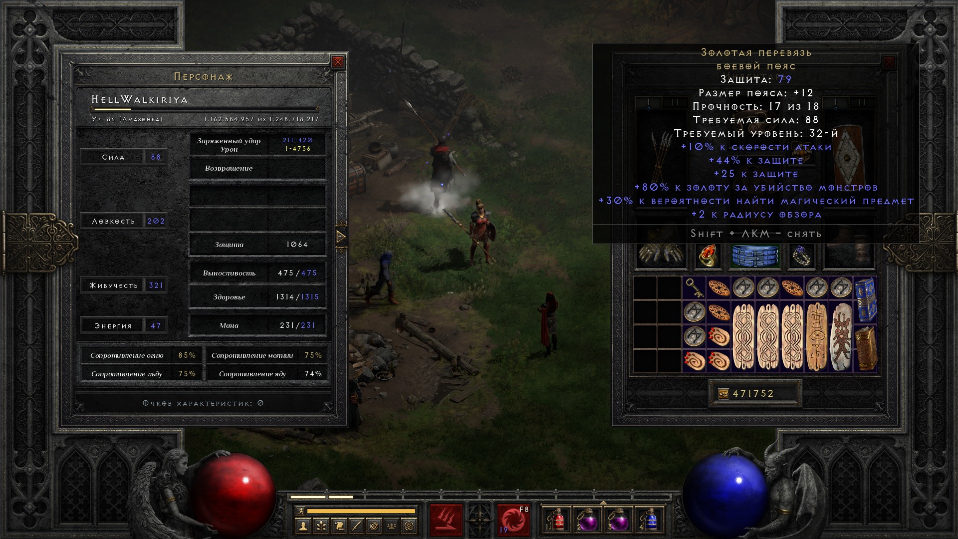 Теперь пришло время прокачки в нормальной локации – Яме, которая имеет 85 уровень. Т.к. пробивают там заметно сильнее, заменил обратно пояс и чармы с +мф на пояс и чармы на +здоровье.