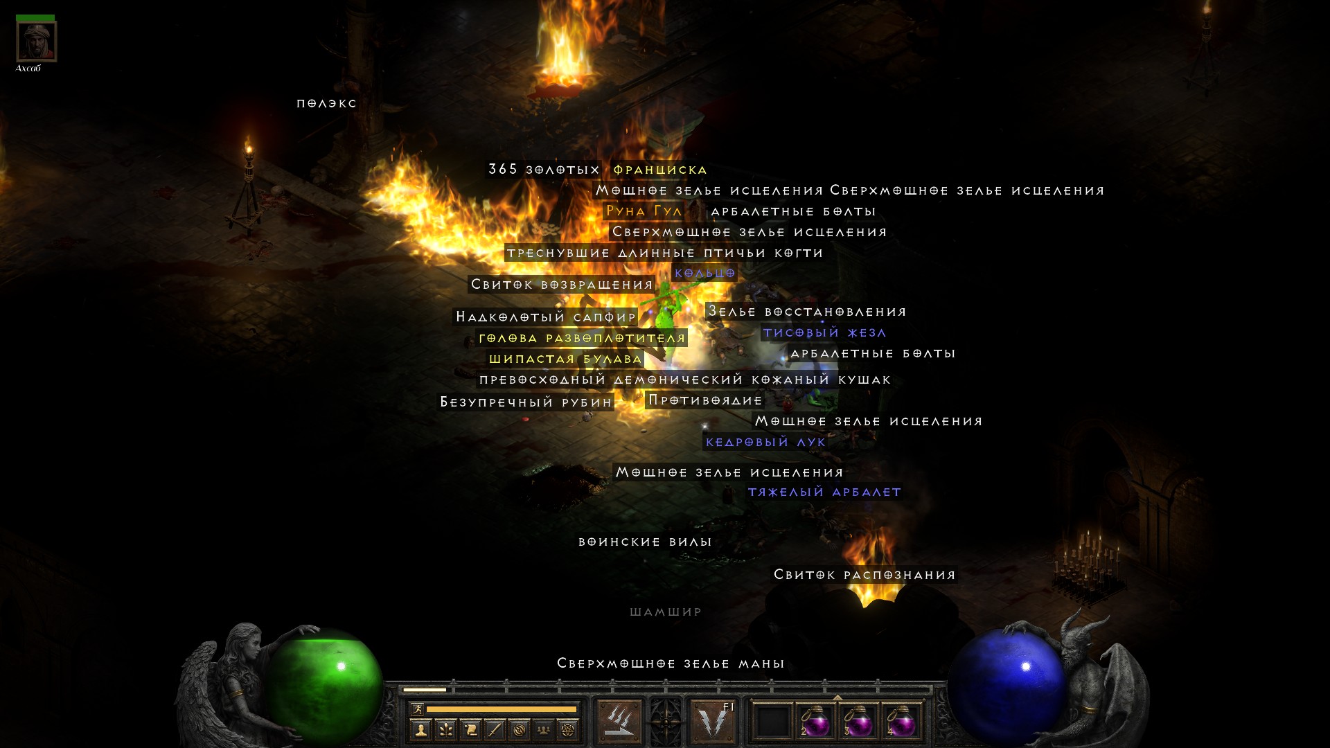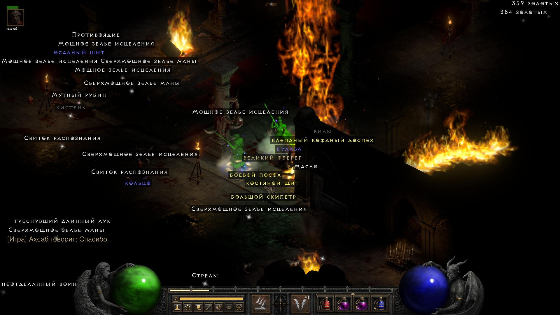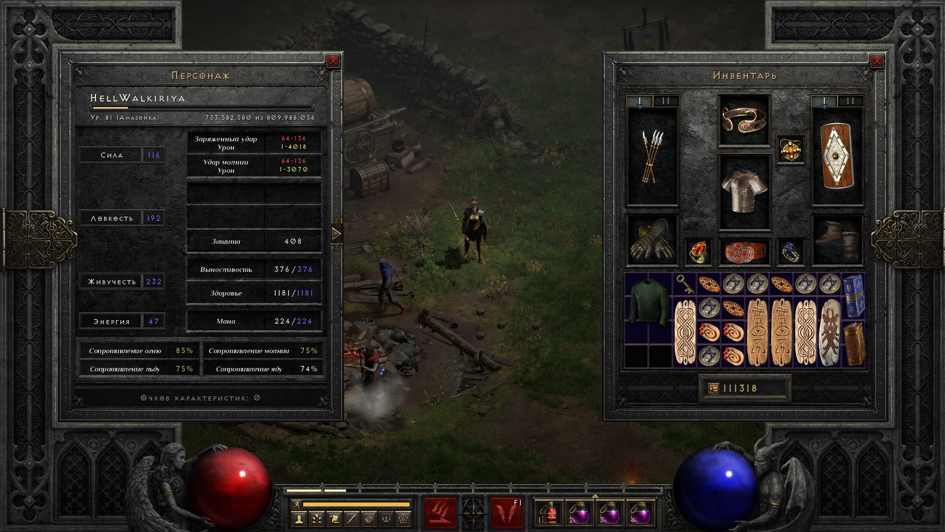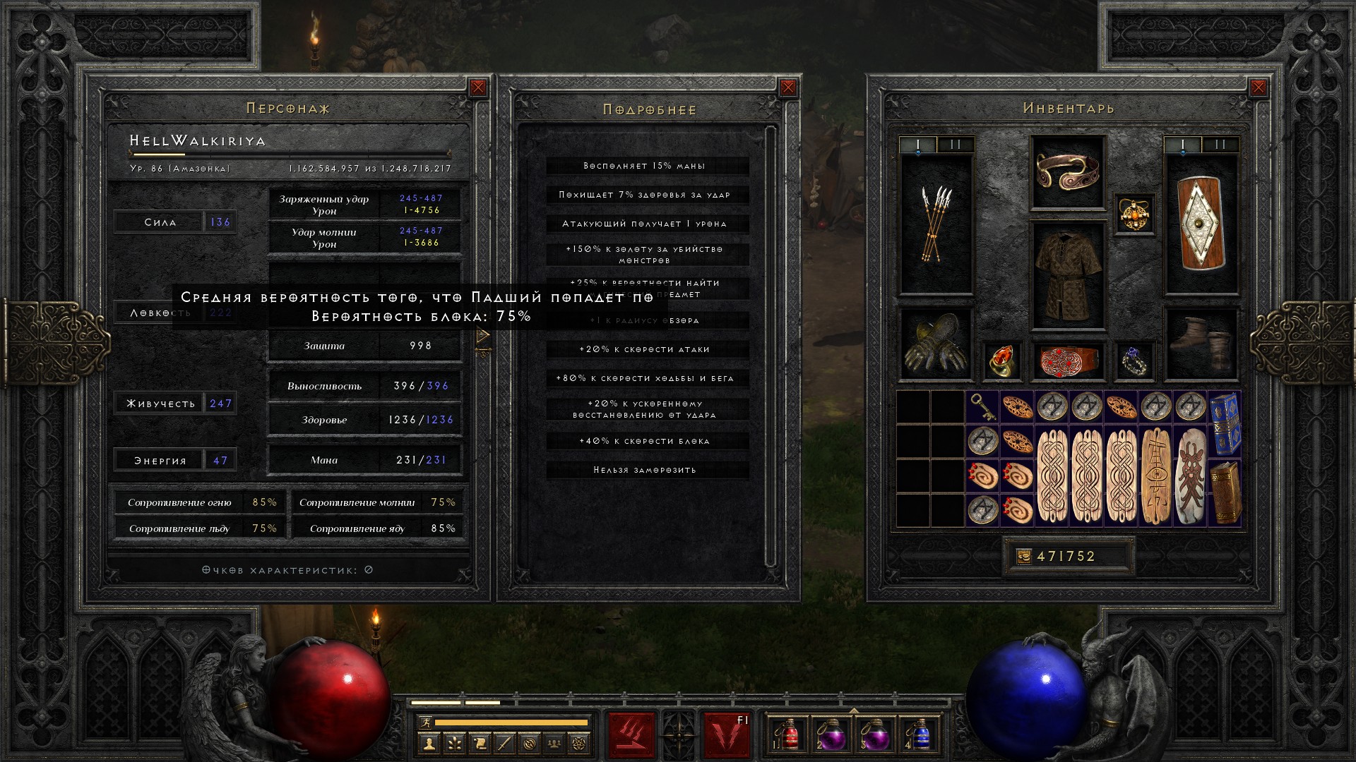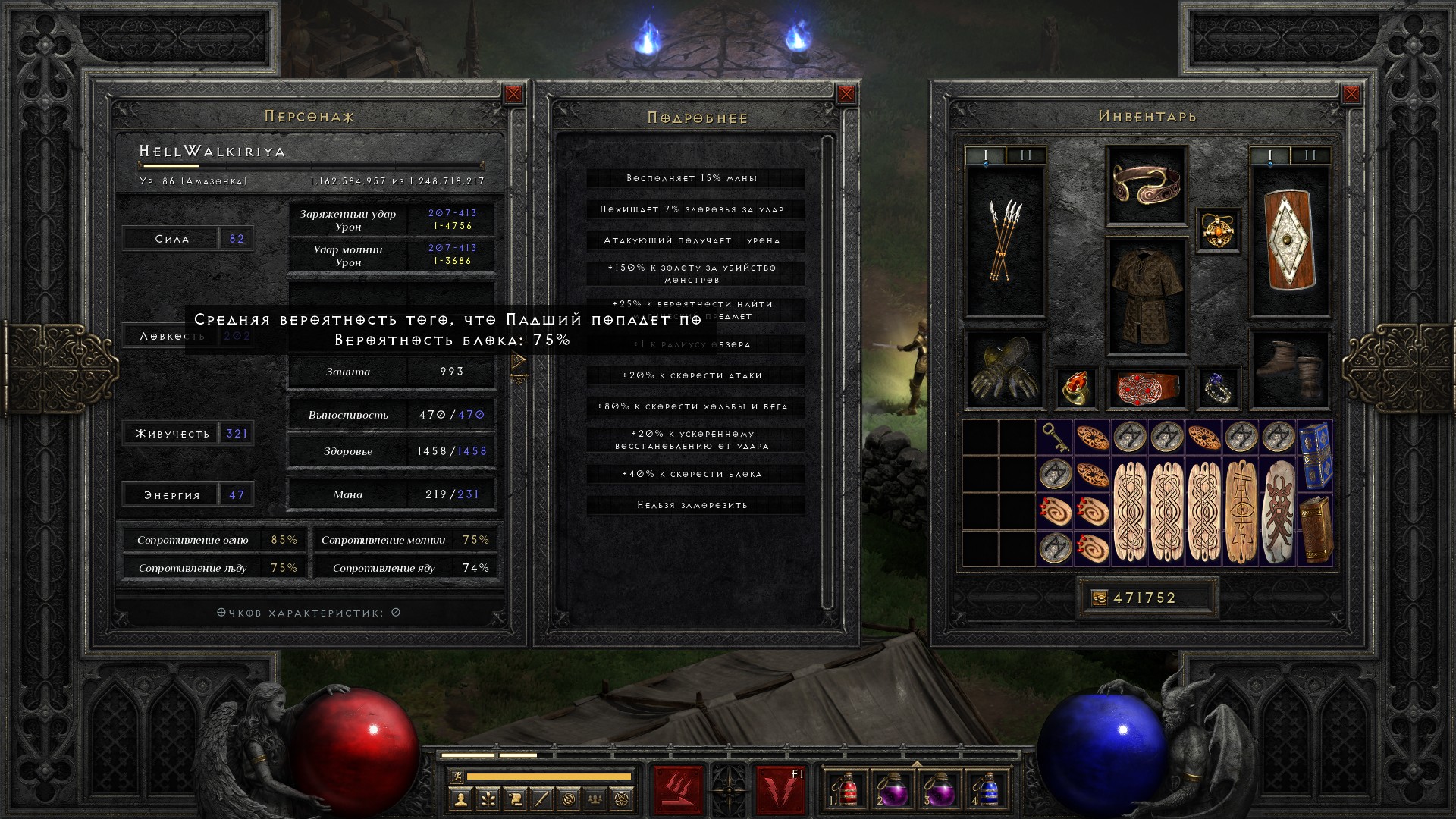 Теперь пришло время прокачки в нормальной локации – Яме, которая имеет 85 уровень. Т.к. пробивают там заметно сильнее, заменил обратно пояс и чармы с +мф на пояс и чармы на +здоровье.