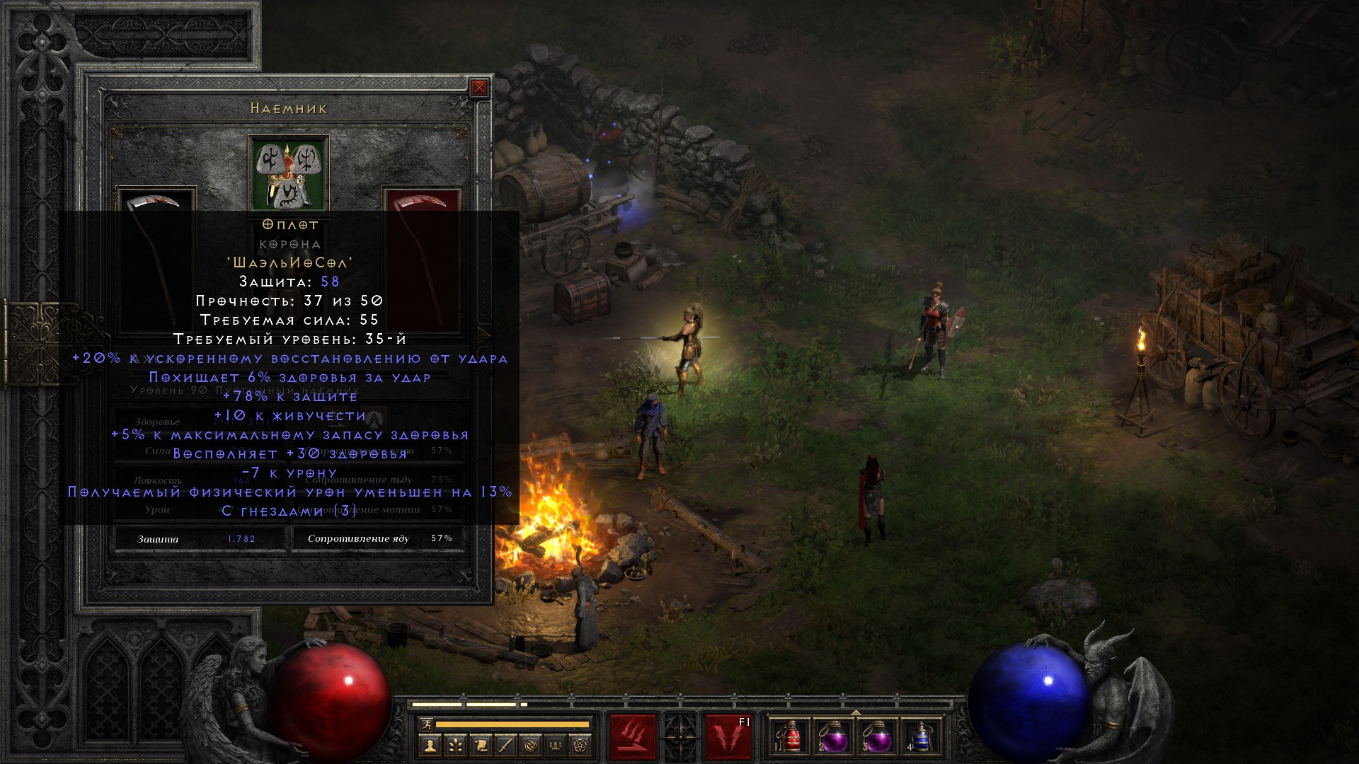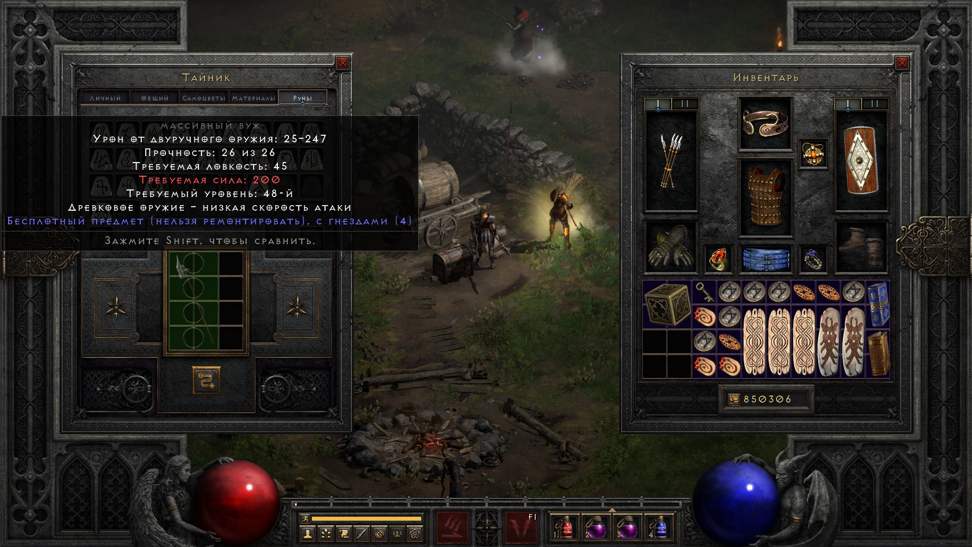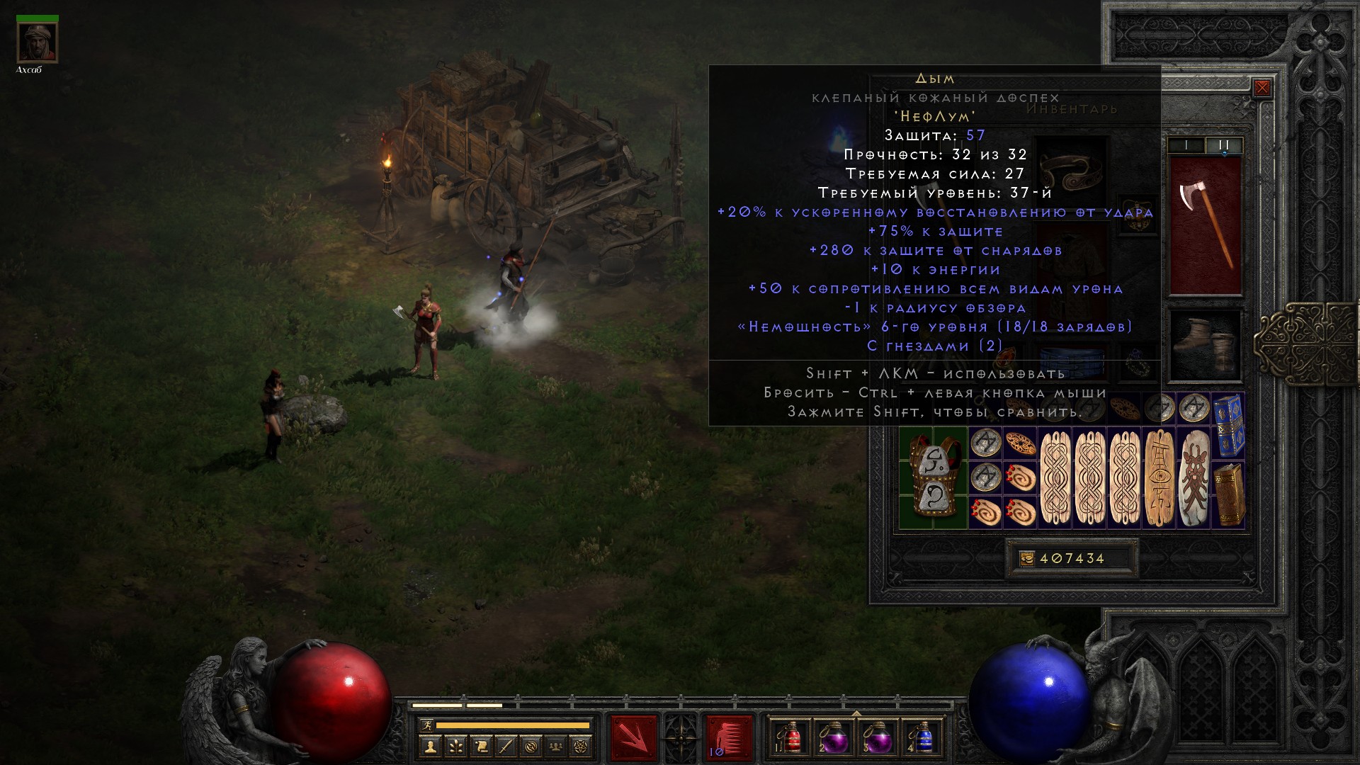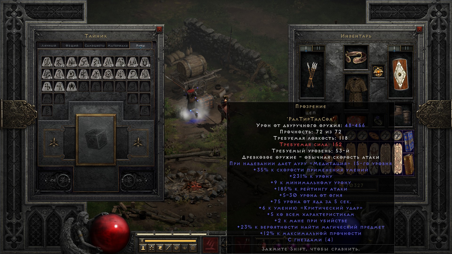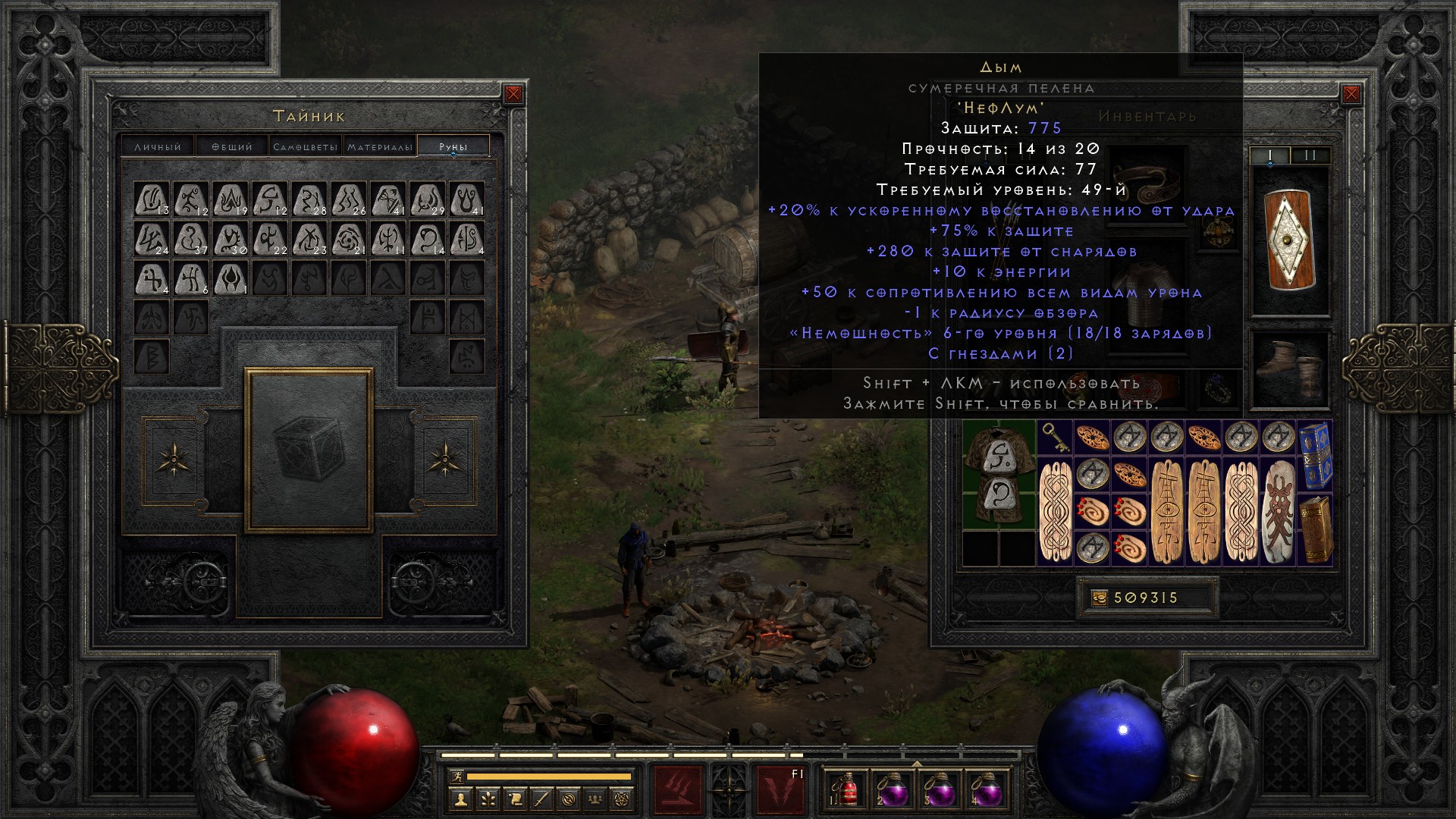 Возвращаю в инвентарь великий чарм на +13% ко всем сопротивлениям и меня старую броню на броню с рунным словом Дым, которое дает +50% ко всем сопротивлениям.