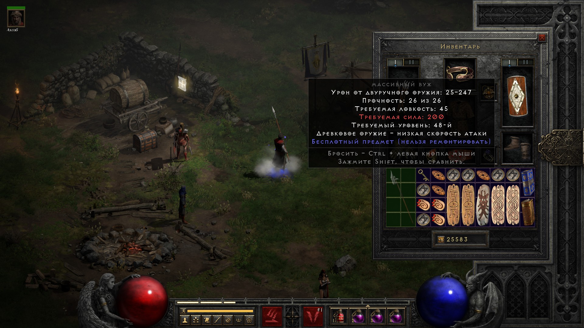 Неплохой итоговый урон получился, но требует 200 силы, мой наемник сможет её использовать только на 91 уровне.