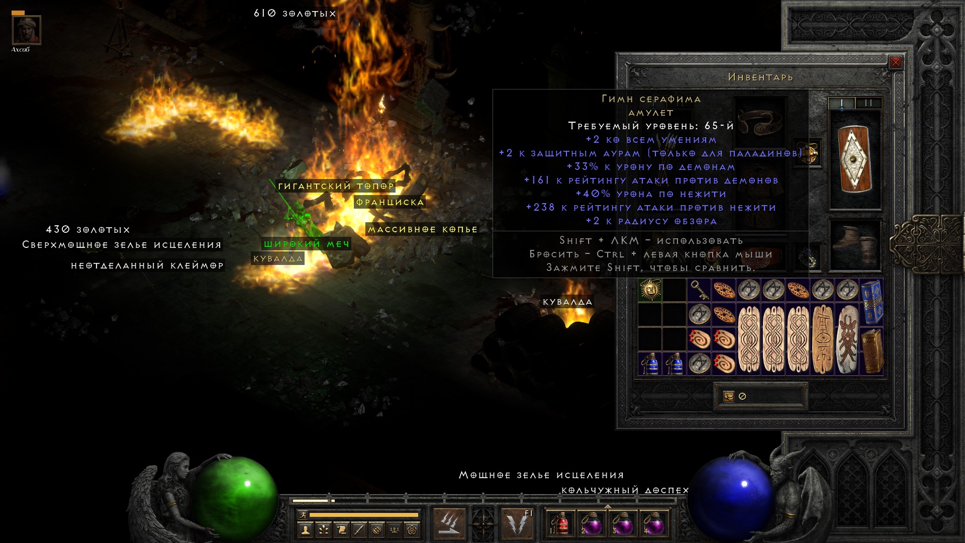 По итогу убил Андариэль 200 раз, но учитывая, что с 30-40% вероятностью там вместе с Андариэль генерирурется пачка потусторонних (это название монстра, если что) с неуязвимостью к молнии – фактически пришлось сделать около 300 забегов. В любом случае это только начало. Фармится она легко, потенциал получения с неё хороших предметов огромный, так что в следующих выпусках продолжу на неё бегать и писать о выпавших предметах.