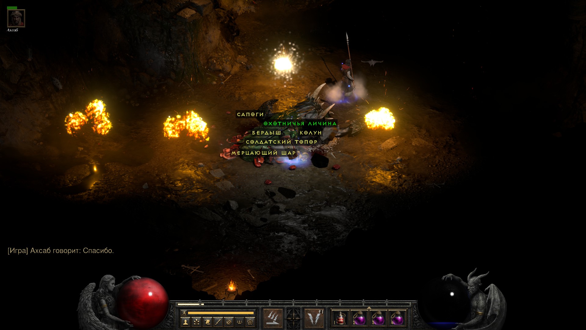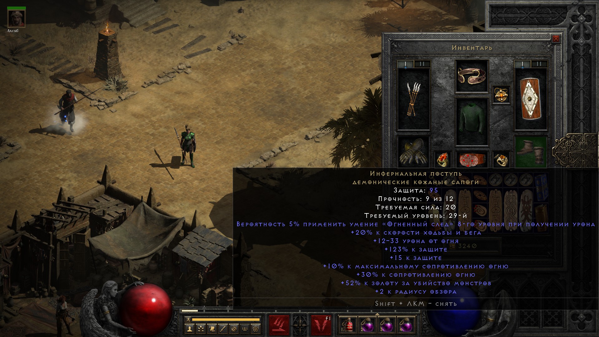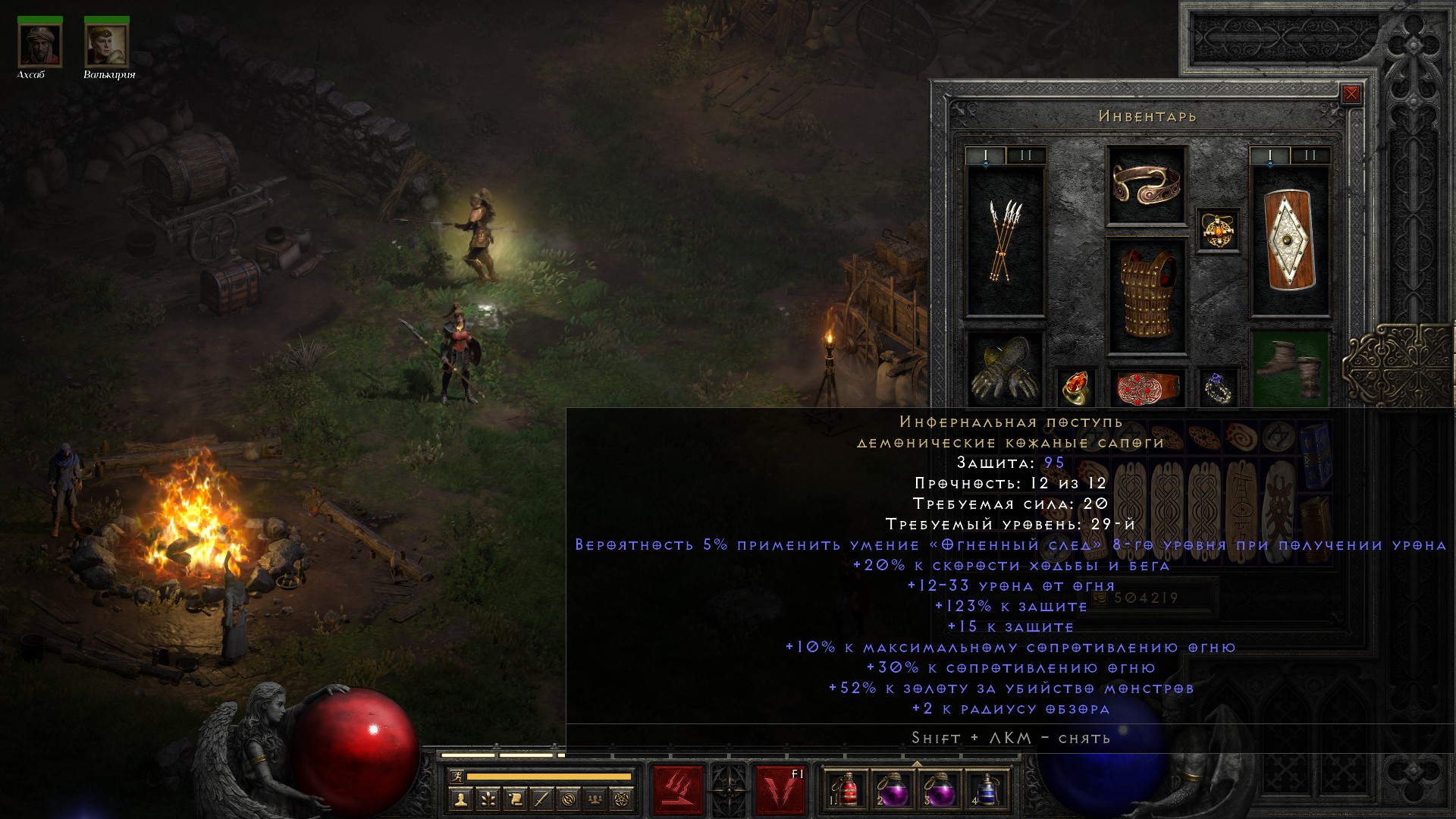 Смотрите, не зря я решил еще покачаться – выпали отличные уникальные ботинки Инфернальная Поступь, которые дают +10% к максимальному сопротивлению огню.