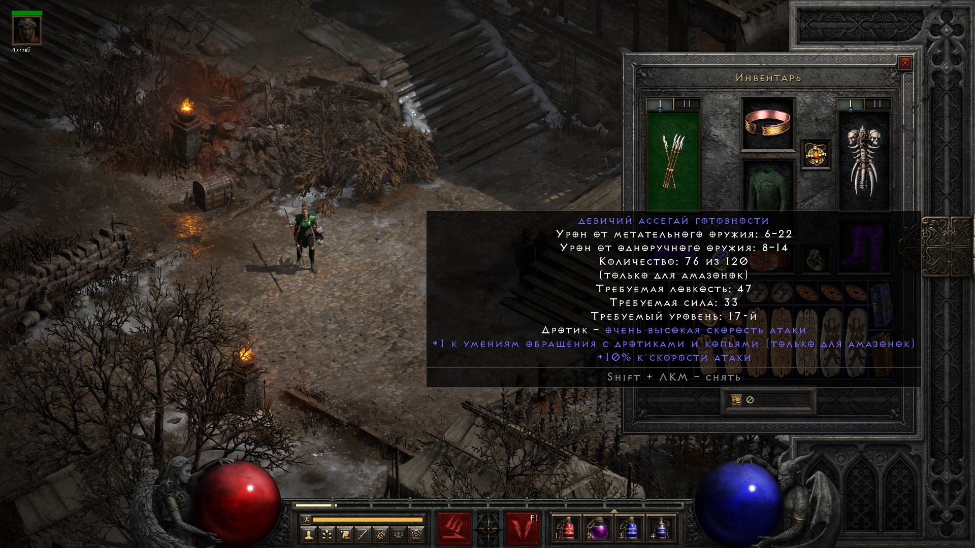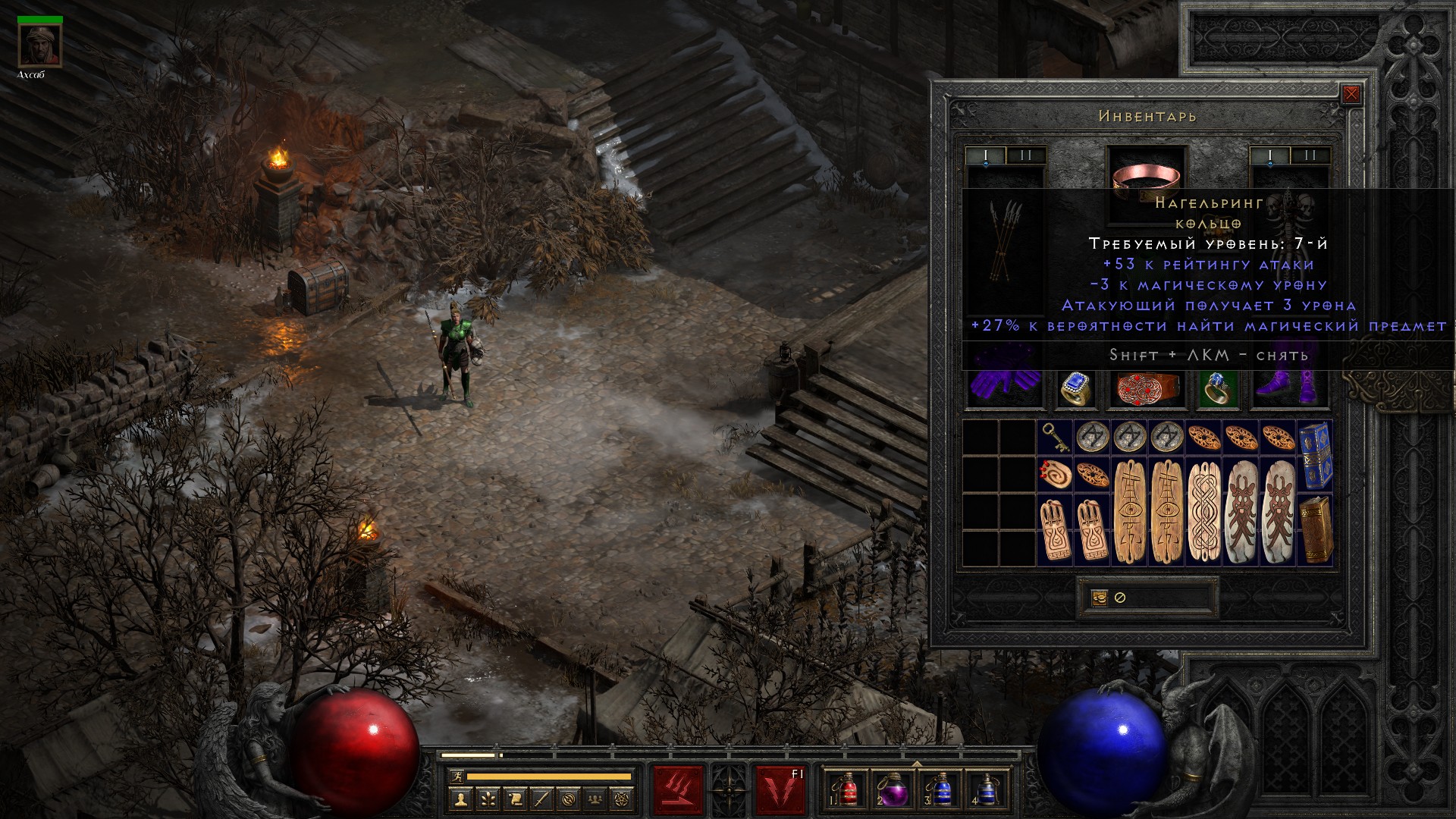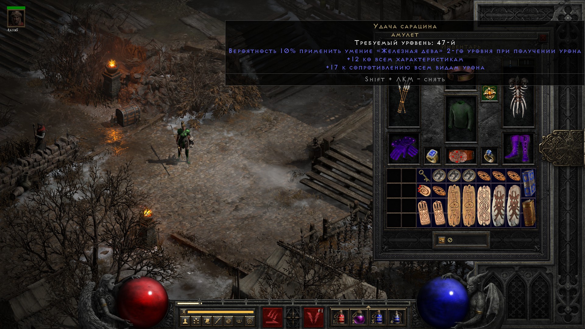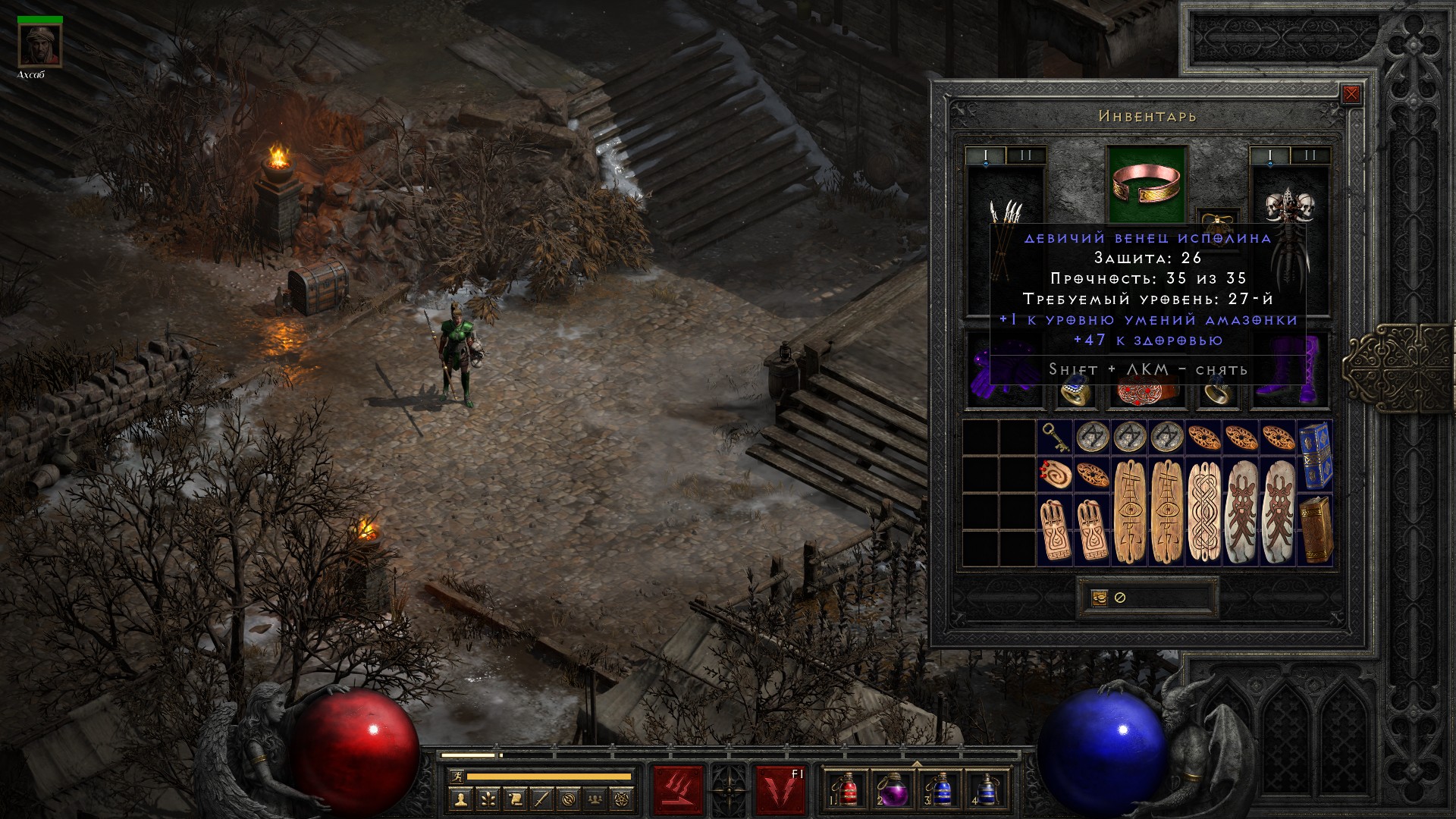 Освобождаю Аню, получаю свиток на +10% ко всем сопротивлениям, немного разгружаю инвентарь от лишних чармов и получаю классовое оружие на амазонку, которое… ни о чем. В общем-то как обычно.