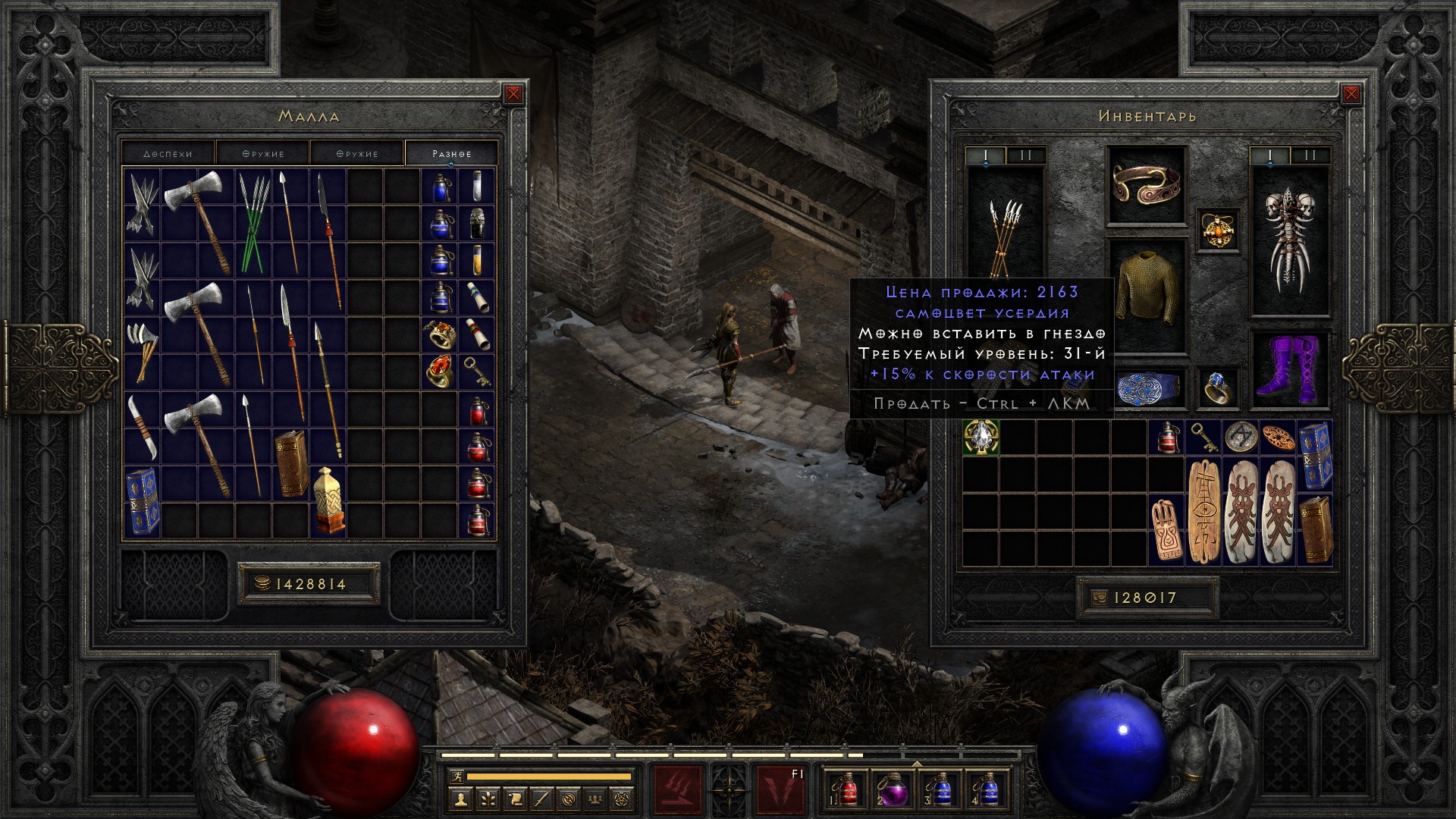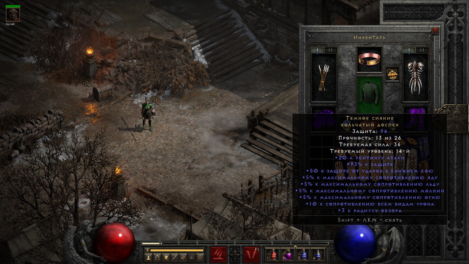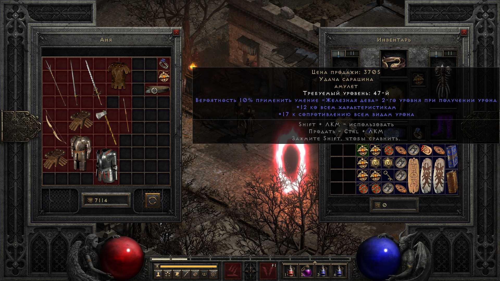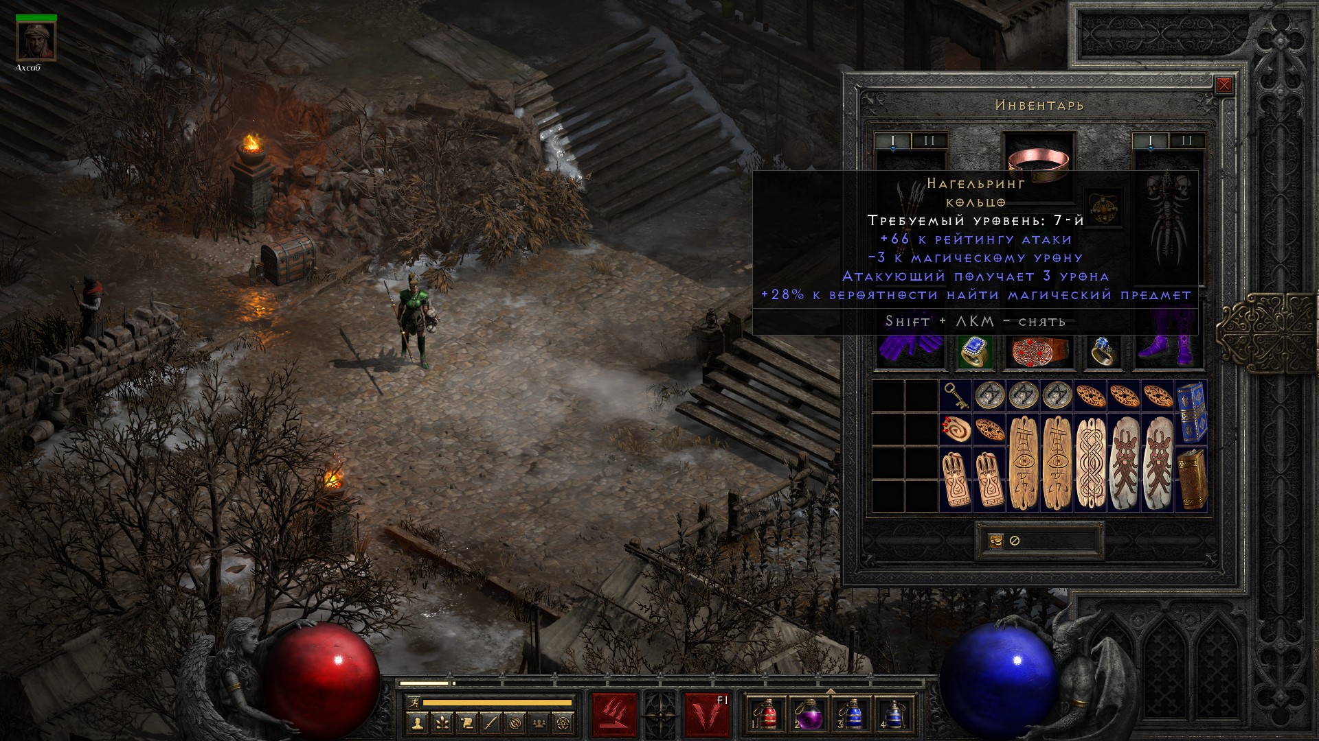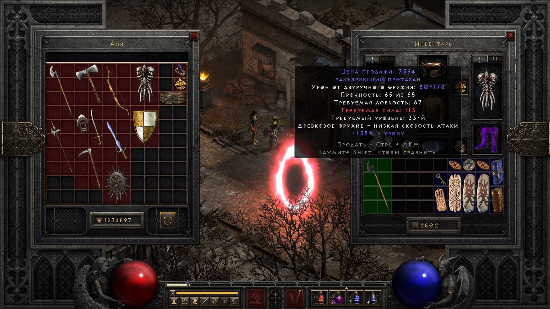 Освобождаю Аню, получаю свиток на +10% ко всем сопротивлениям, немного разгружаю инвентарь от лишних чармов и получаю классовое оружие на амазонку, которое… ни о чем. В общем-то как обычно.