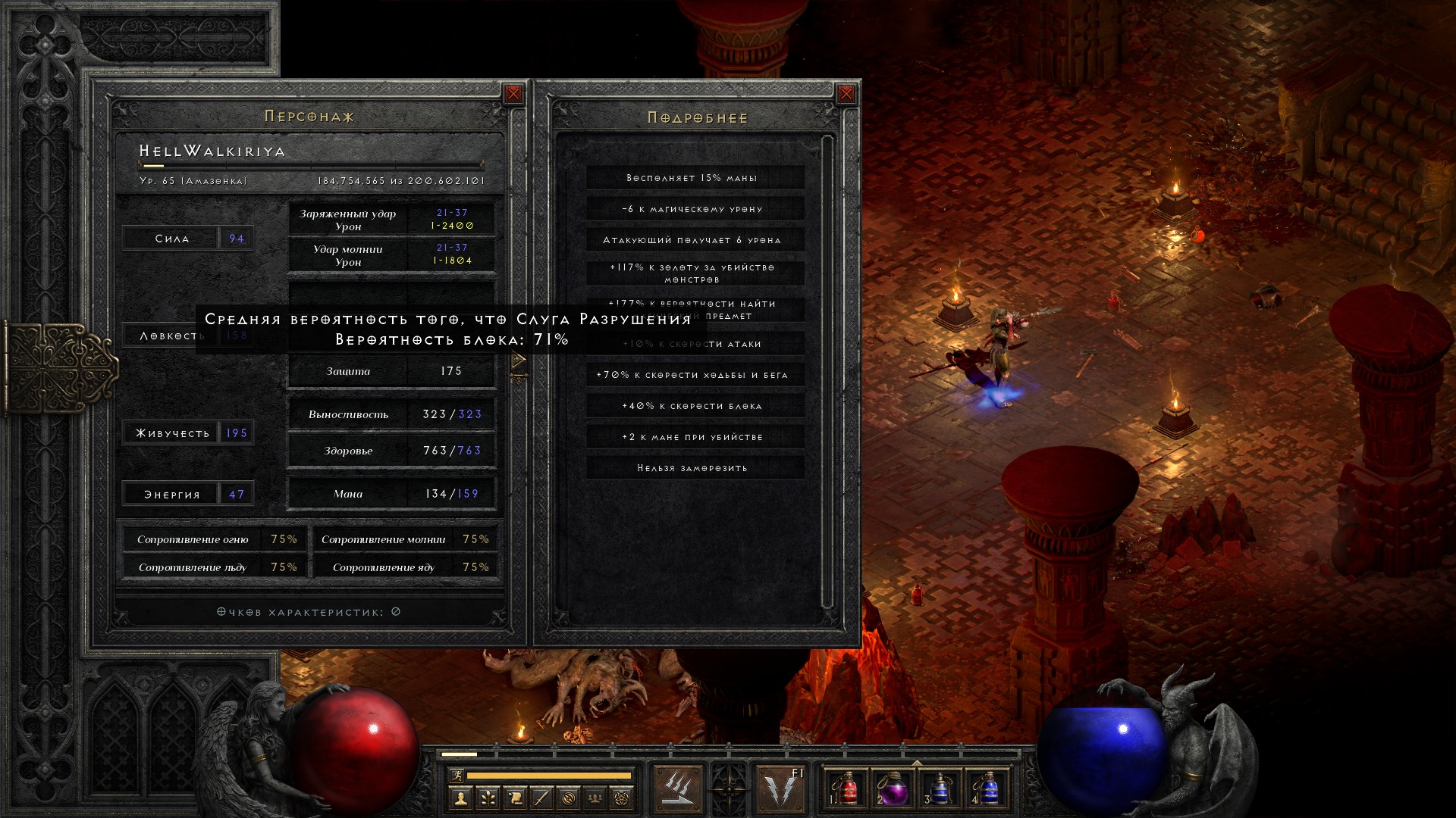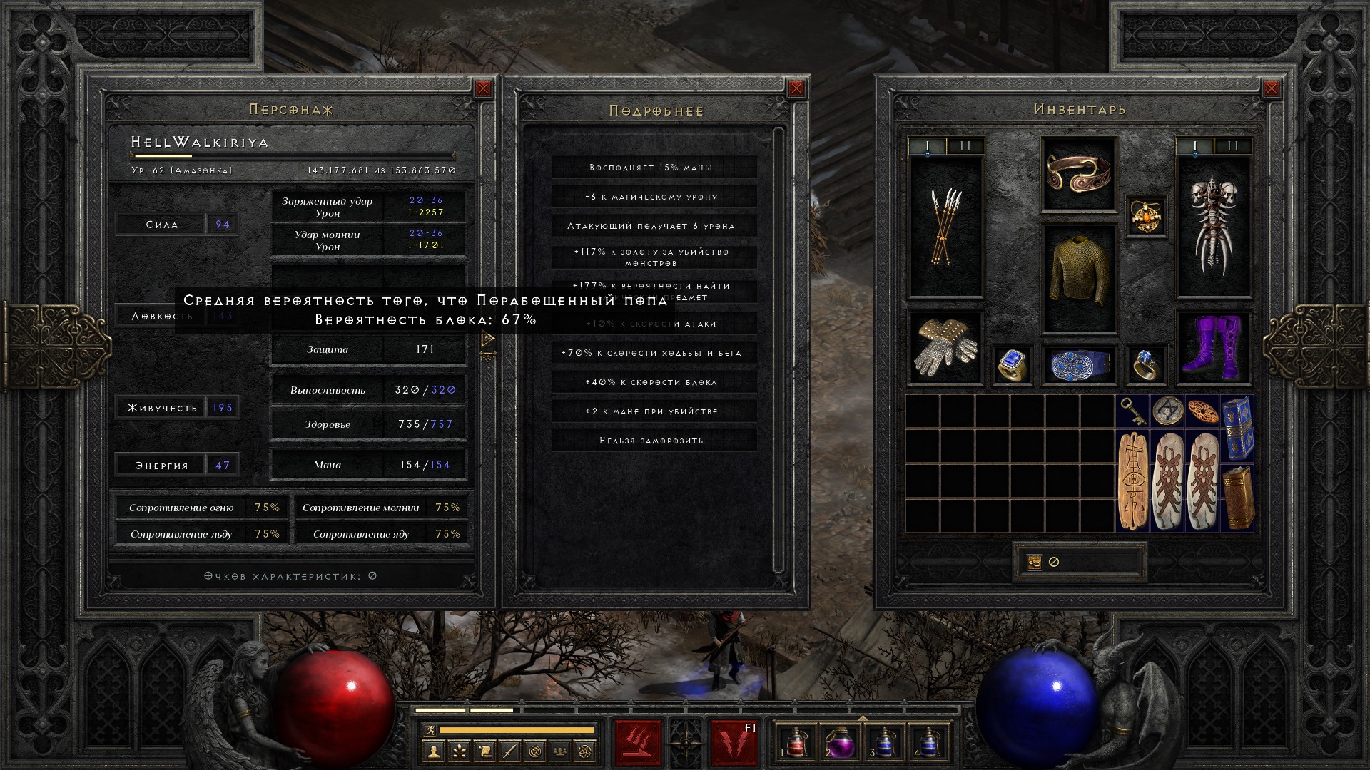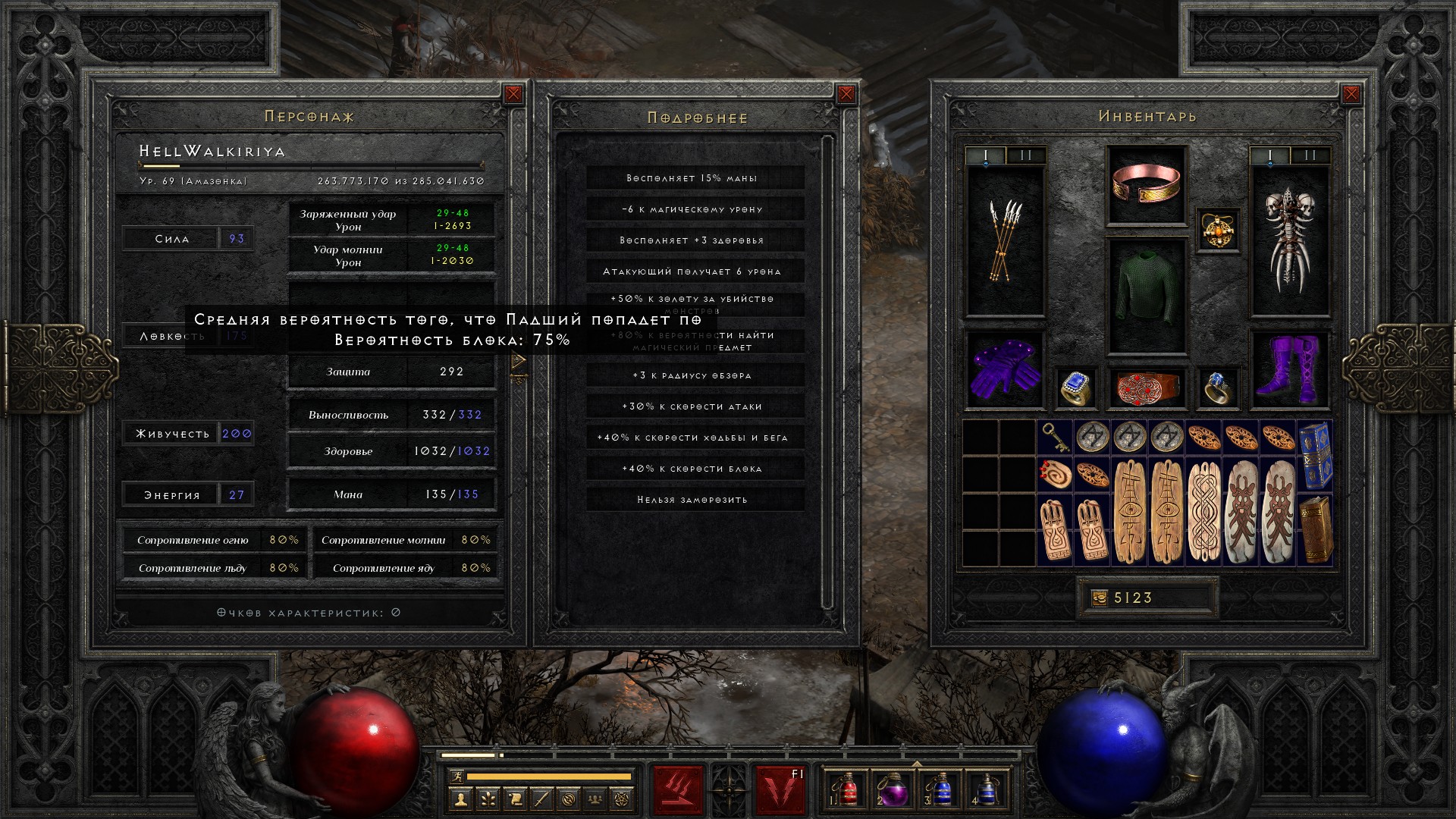 Добавляю чарм на +2 ловкости и получаю 75% блока. Ну что ж, кап достигнут. Теперь остается прокачивать только хп и урон.