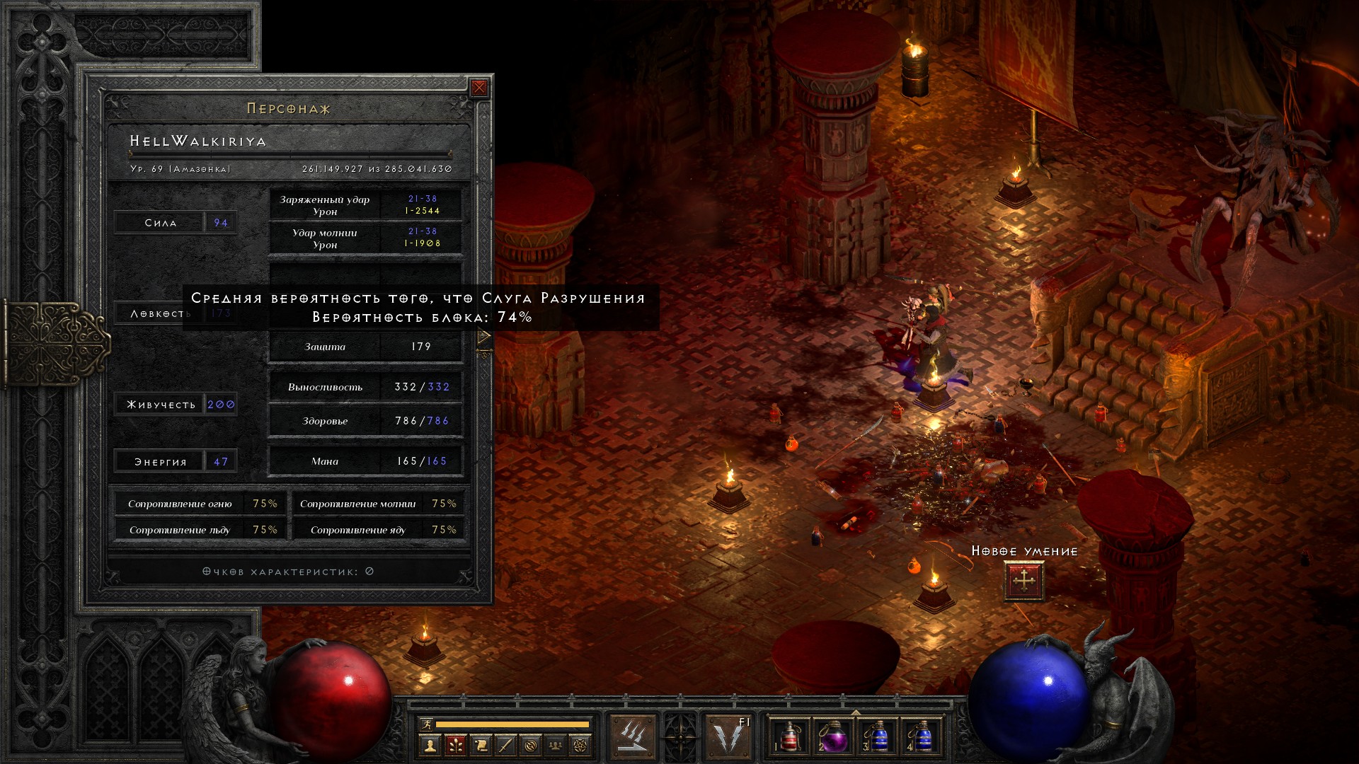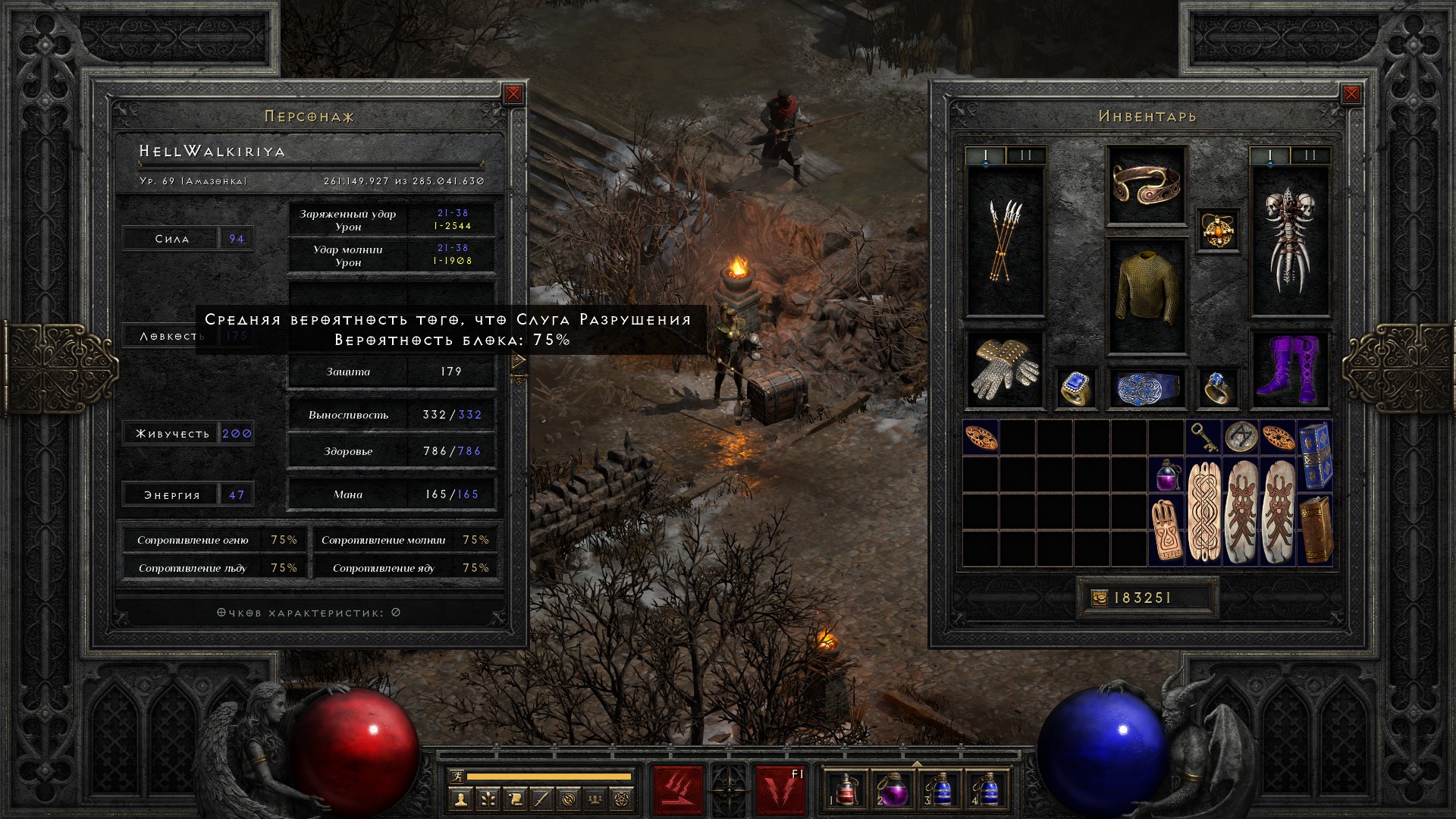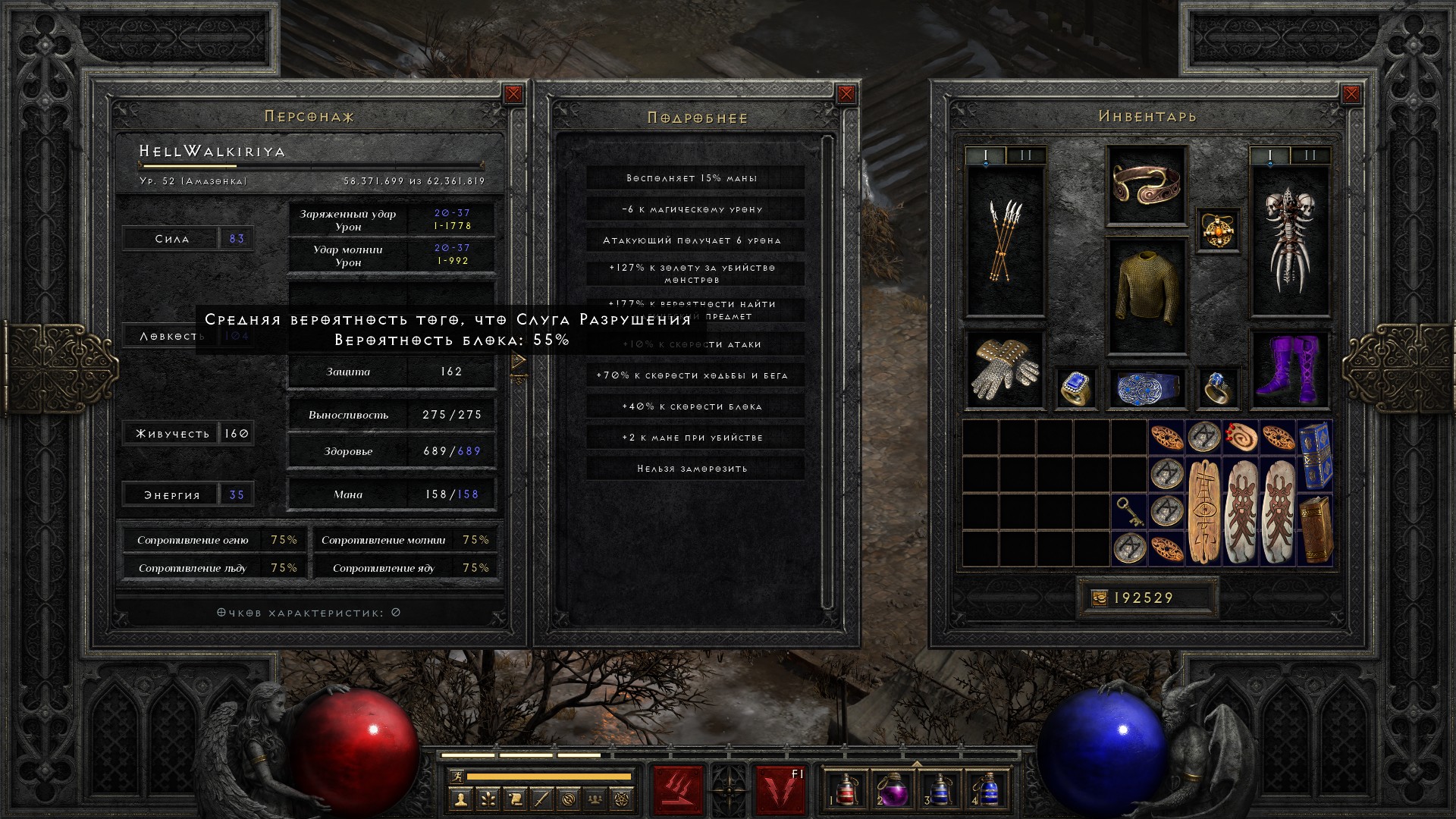 Добавляю чарм на +2 ловкости и получаю 75% блока. Ну что ж, кап достигнут. Теперь остается прокачивать только хп и урон.