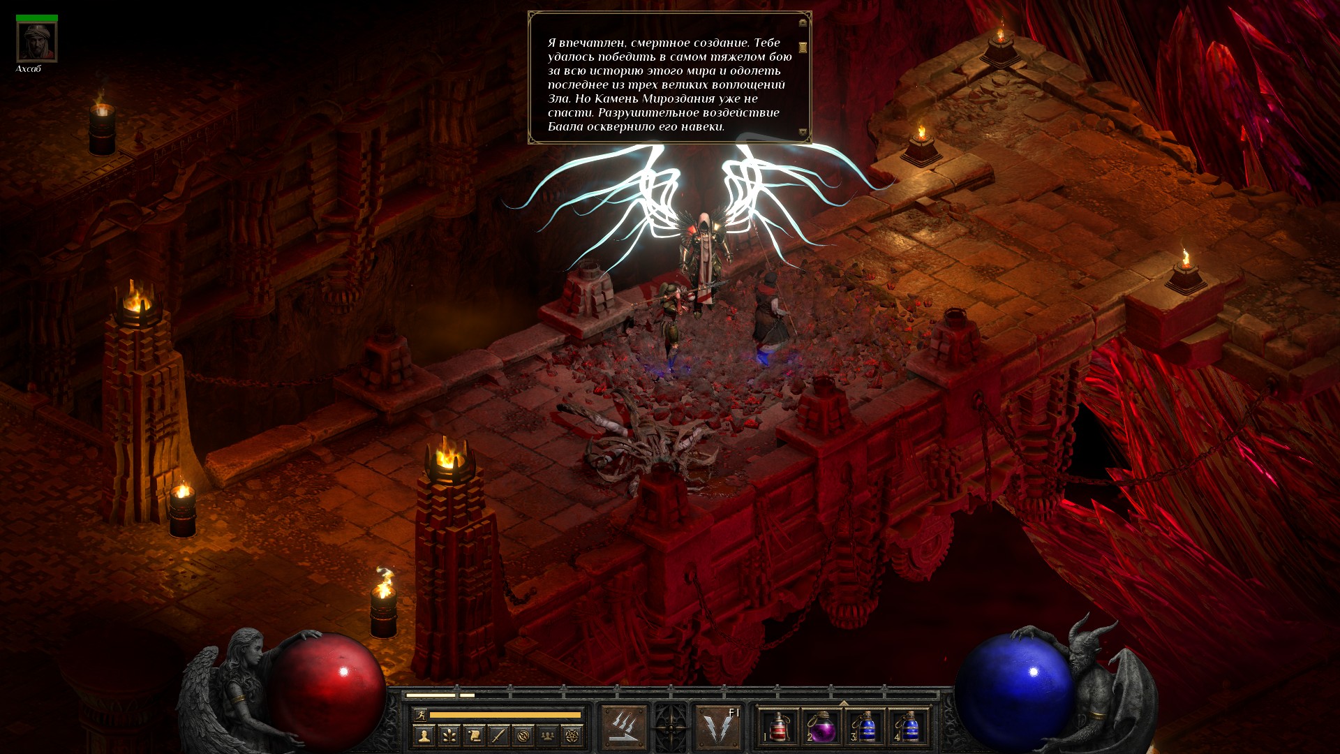 Финальный разговор с Тираэлем. Ну что, обычная сложность, которую проходил одной рукой, закончилась. Впереди Nightmare. В принципе, по сравнению с Hell это тоже релакс-сложность, но посмотрим как пойдет.
