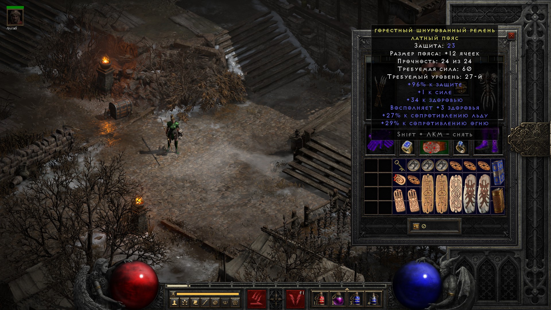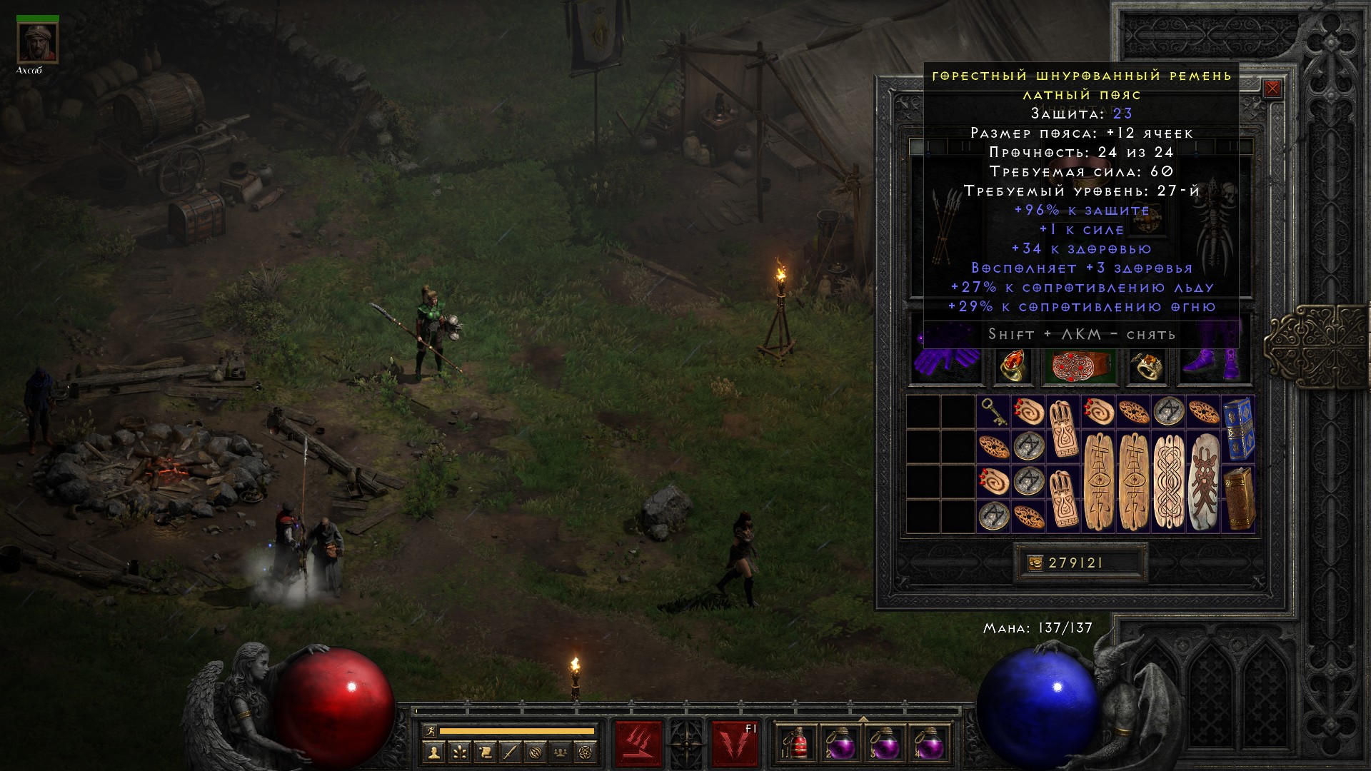 На скриншоте пошел в первый акт чтобы повыбивать камни первого уровня (они нужны для обмена рун на более качественные), и посмотрите какой уникальный пояс выбил. Сейчас он мне уже не нужен, но вот когда буду качать других персонажей – у них будет отличный пояс для старта.