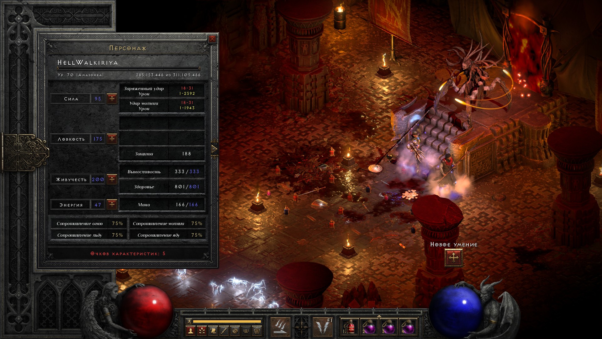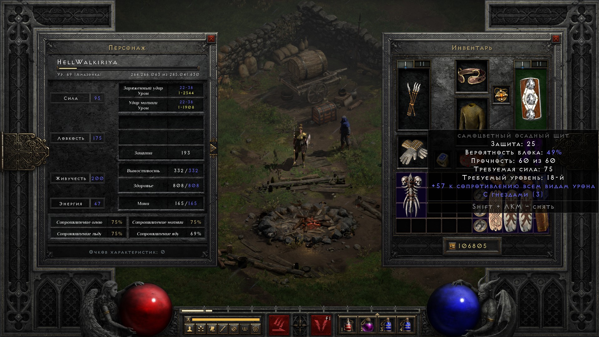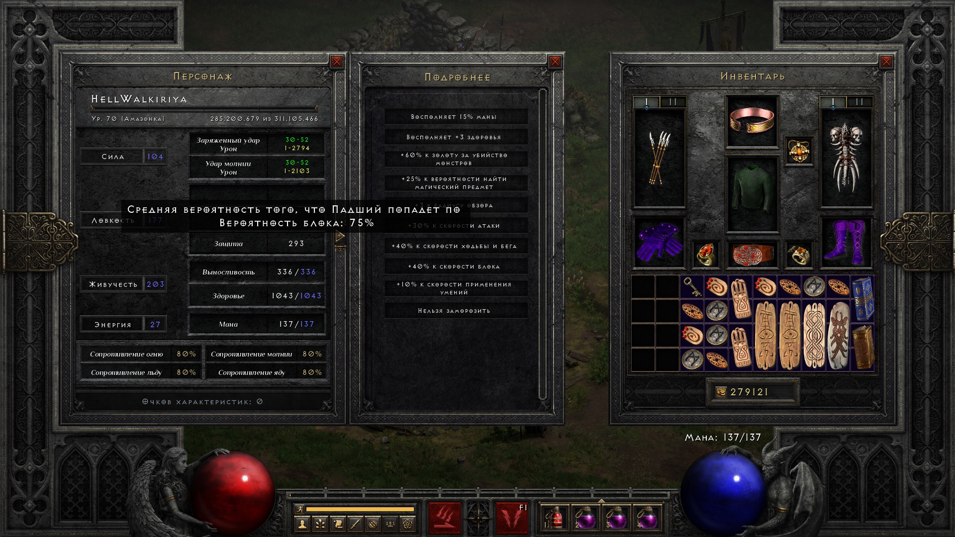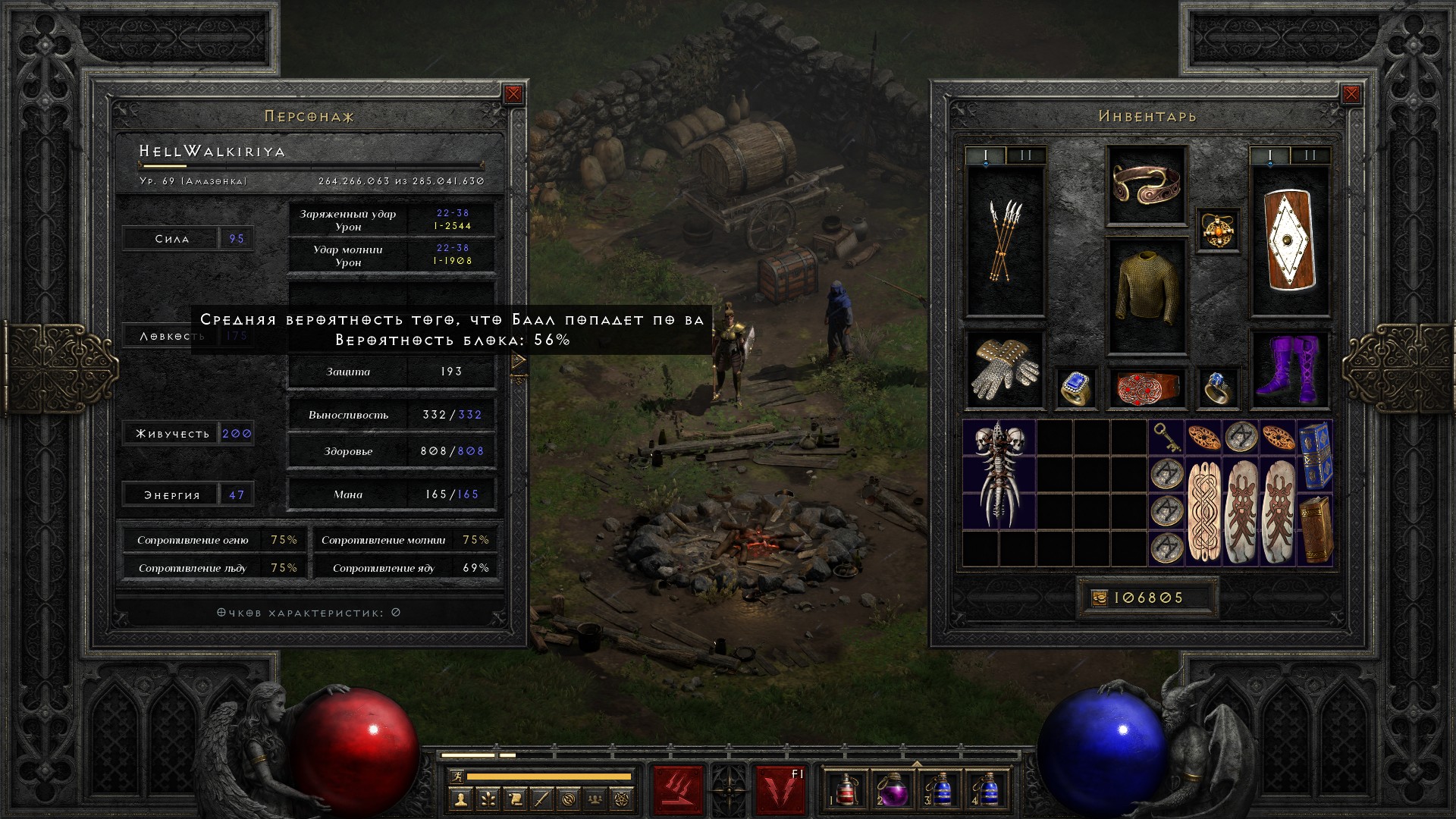 С этого момента характеристики новой амазонки начинают отличаться от амазонки нереального разгона, где я делал упор только на здоровье и урон. Теперь к ним добавляется блок, который постепенно буду доводить до 75%.