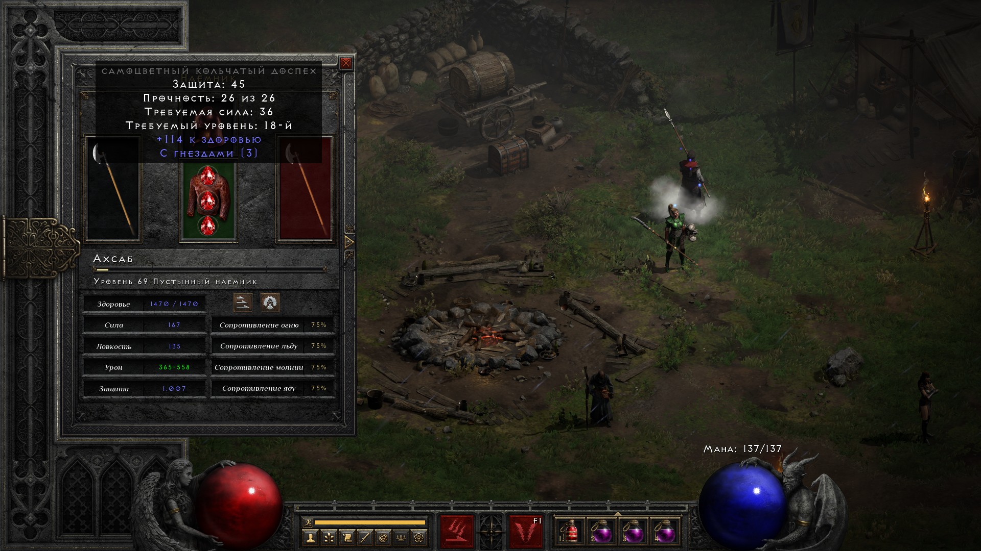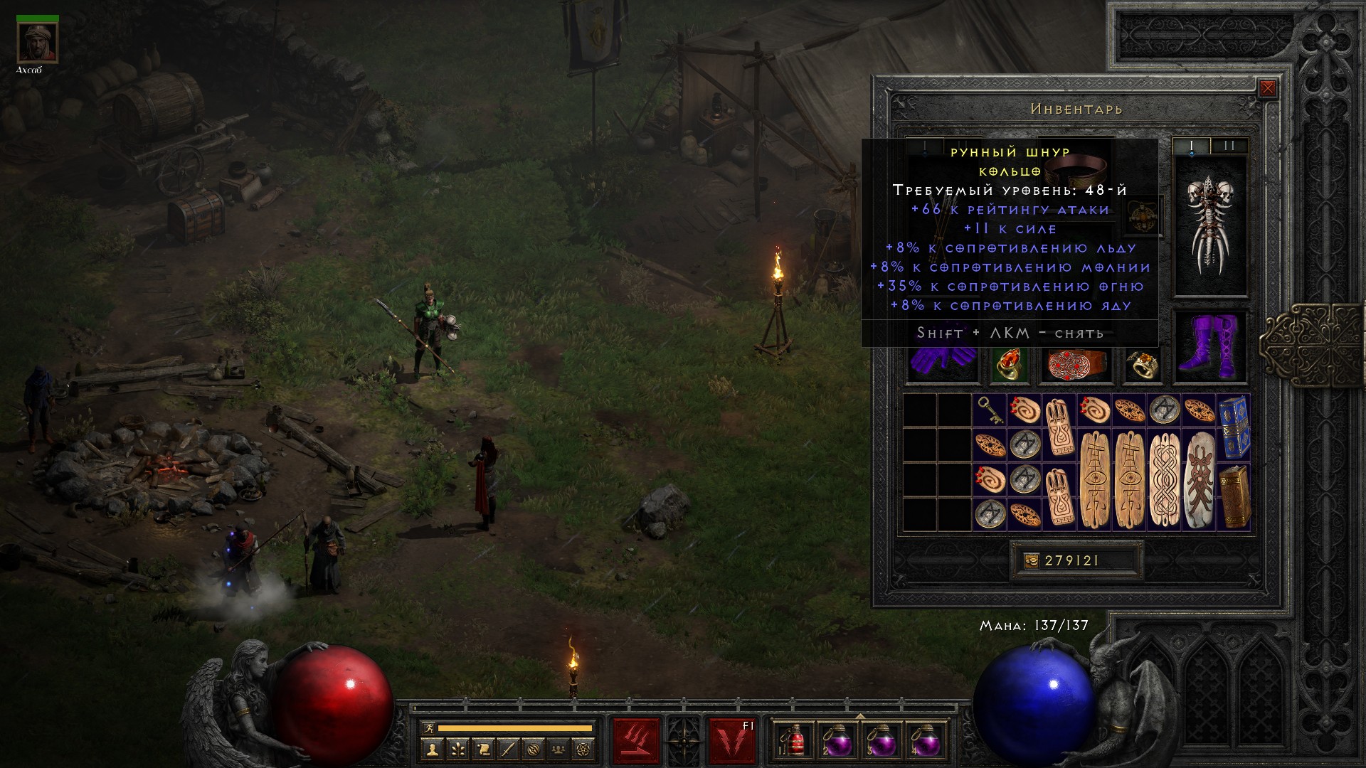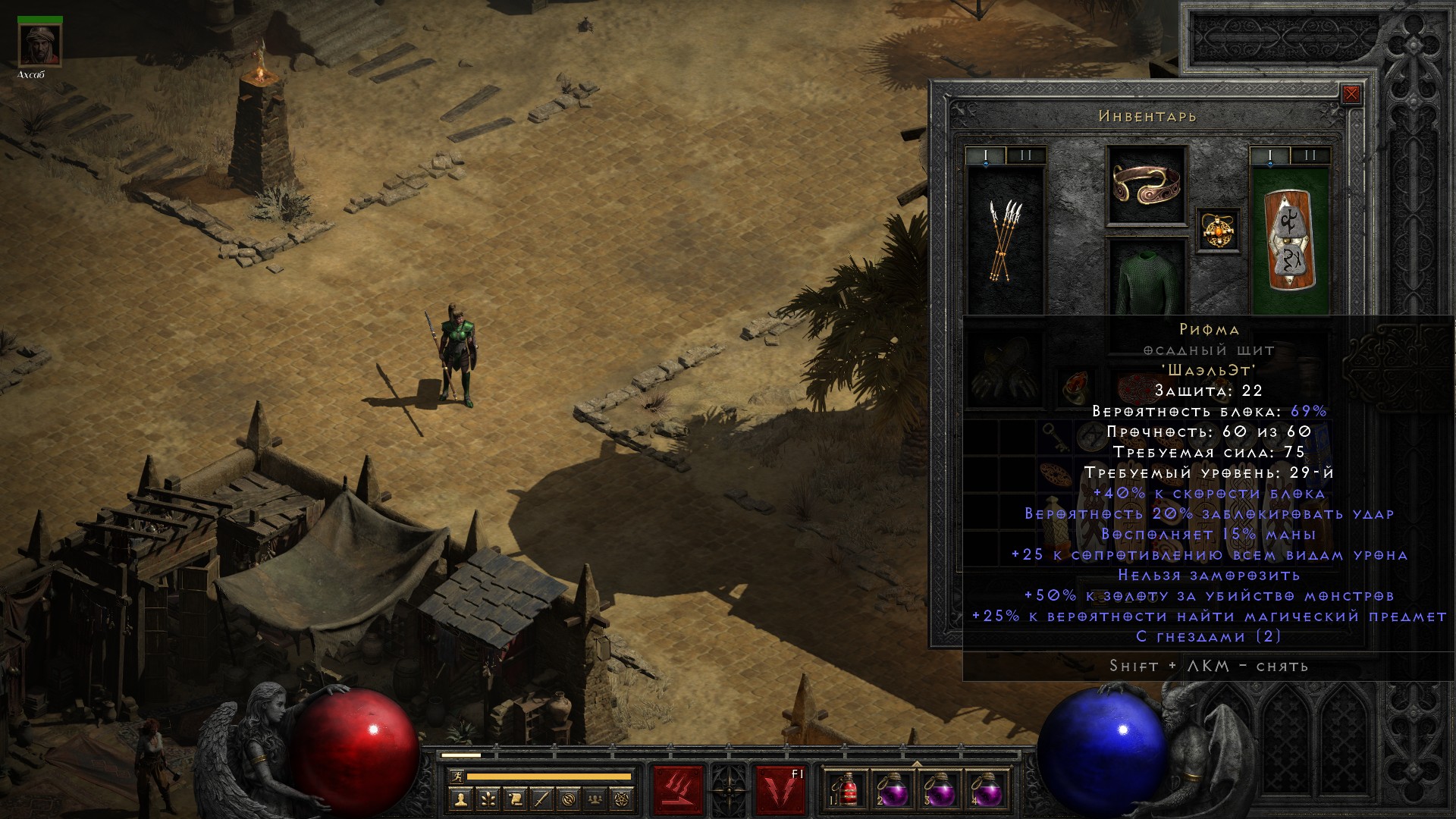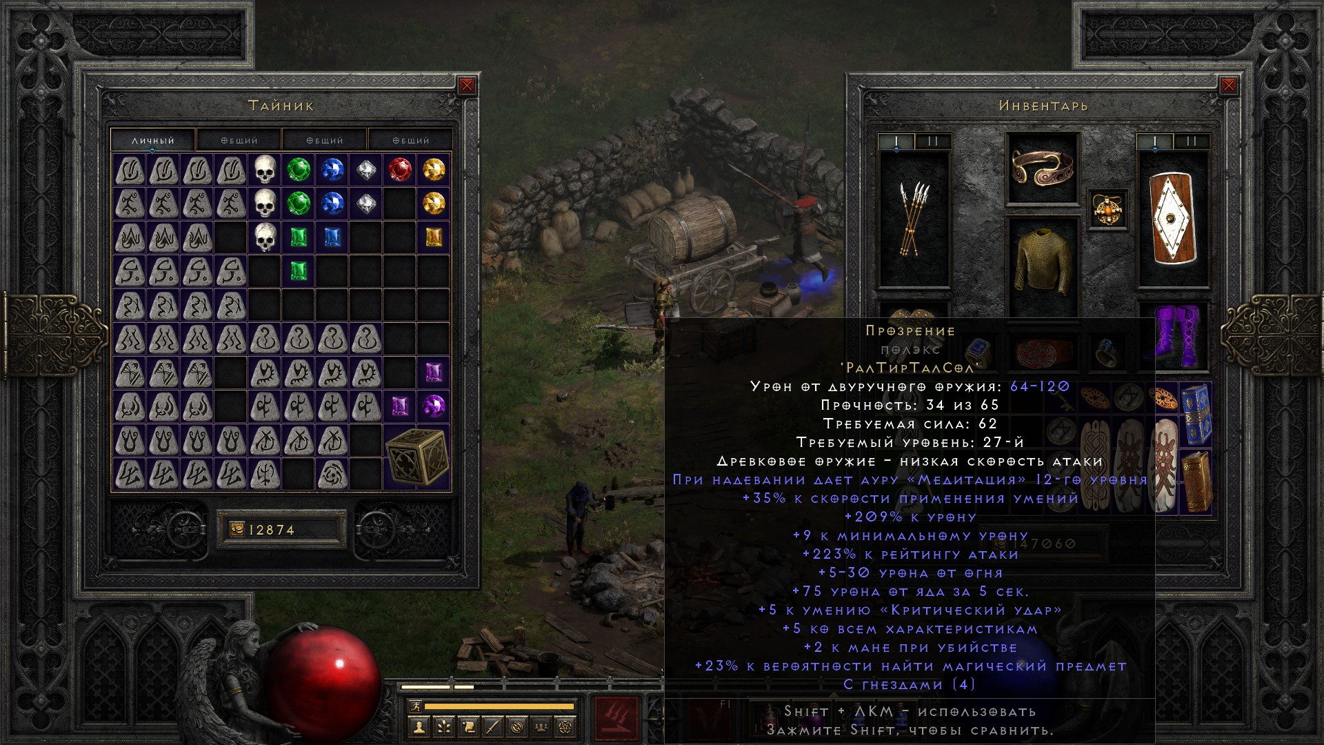 Сопротивления очевидно просели (на сложности Nightmare они получают штраф в -40%), идея что делать приходит сразу – возвращать щит с тремя превосходными алмазами.