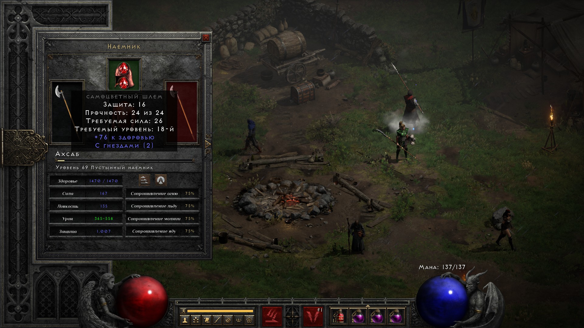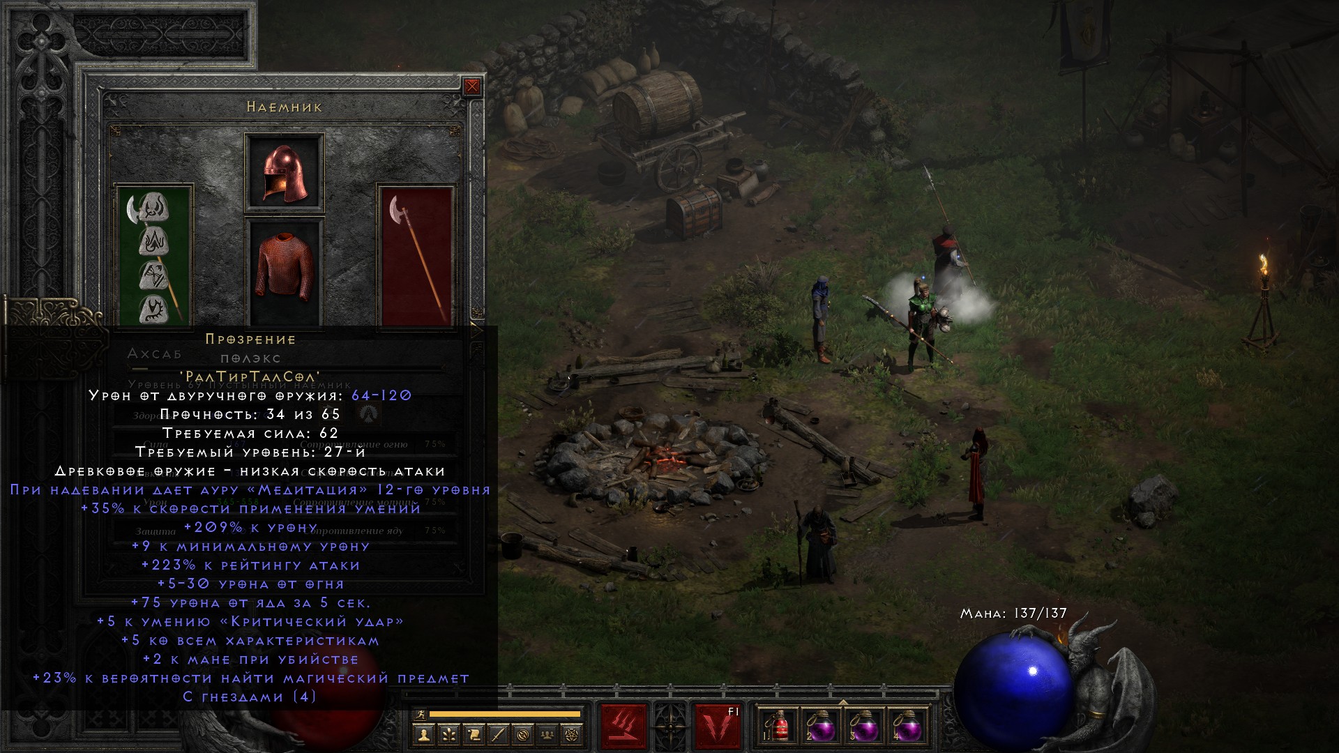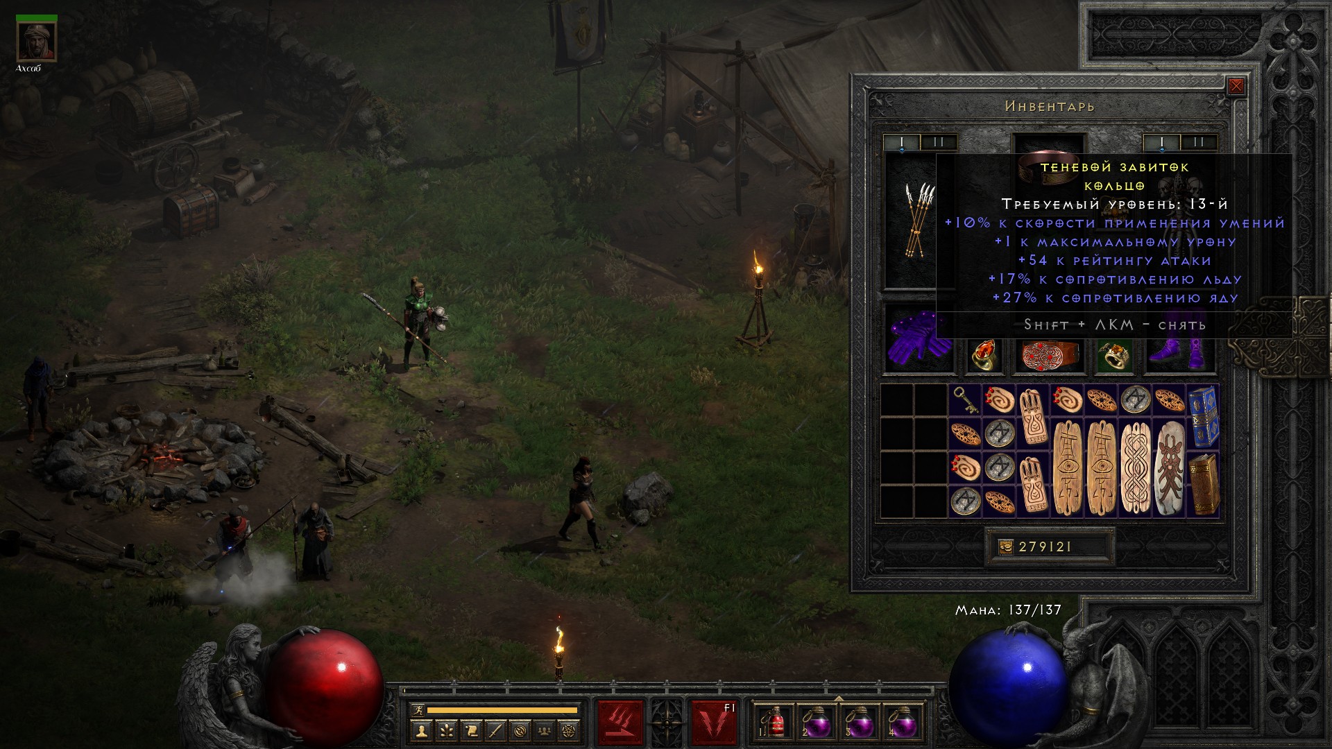 Сопротивления очевидно просели (на сложности Nightmare они получают штраф в -40%), идея что делать приходит сразу – возвращать щит с тремя превосходными алмазами.