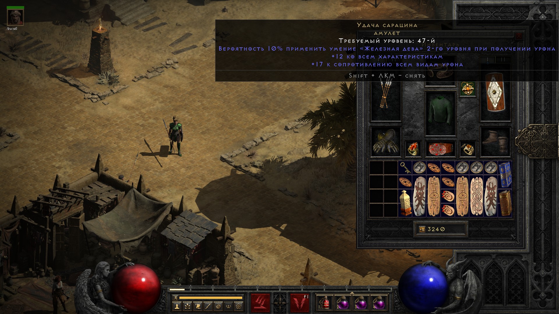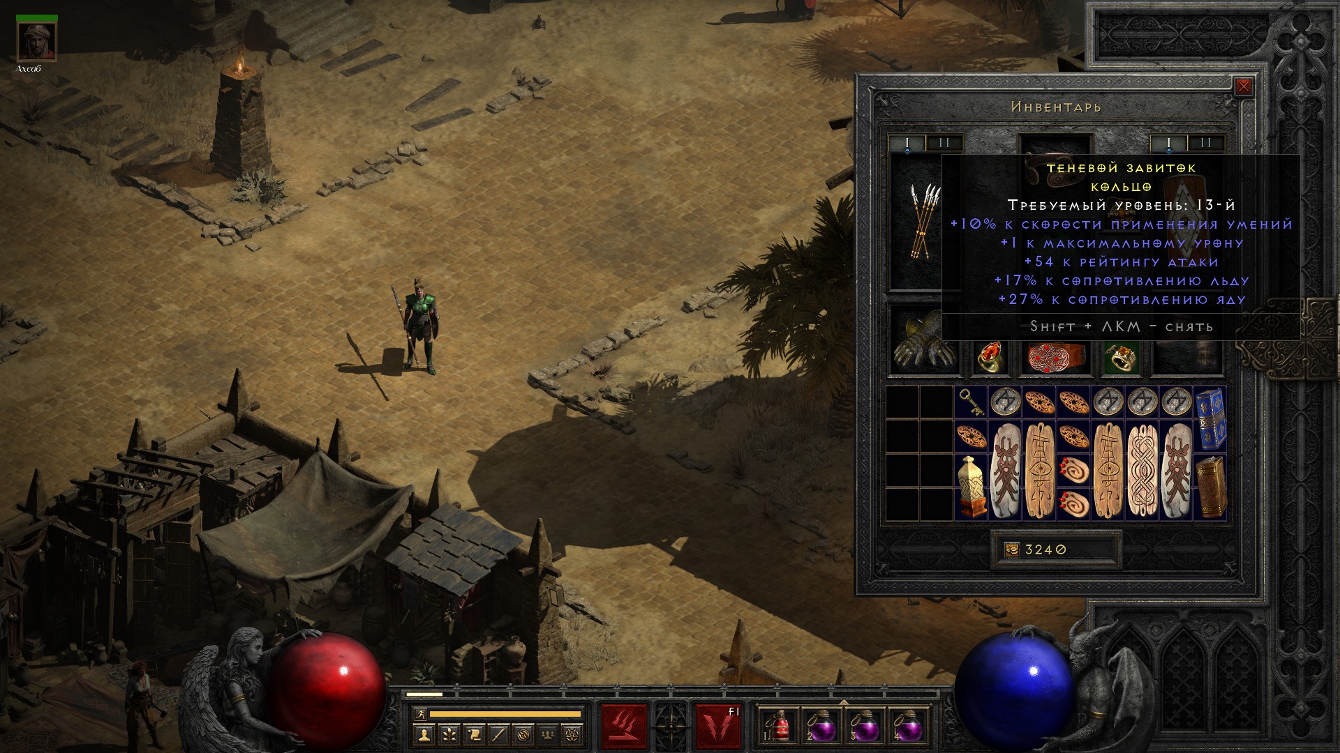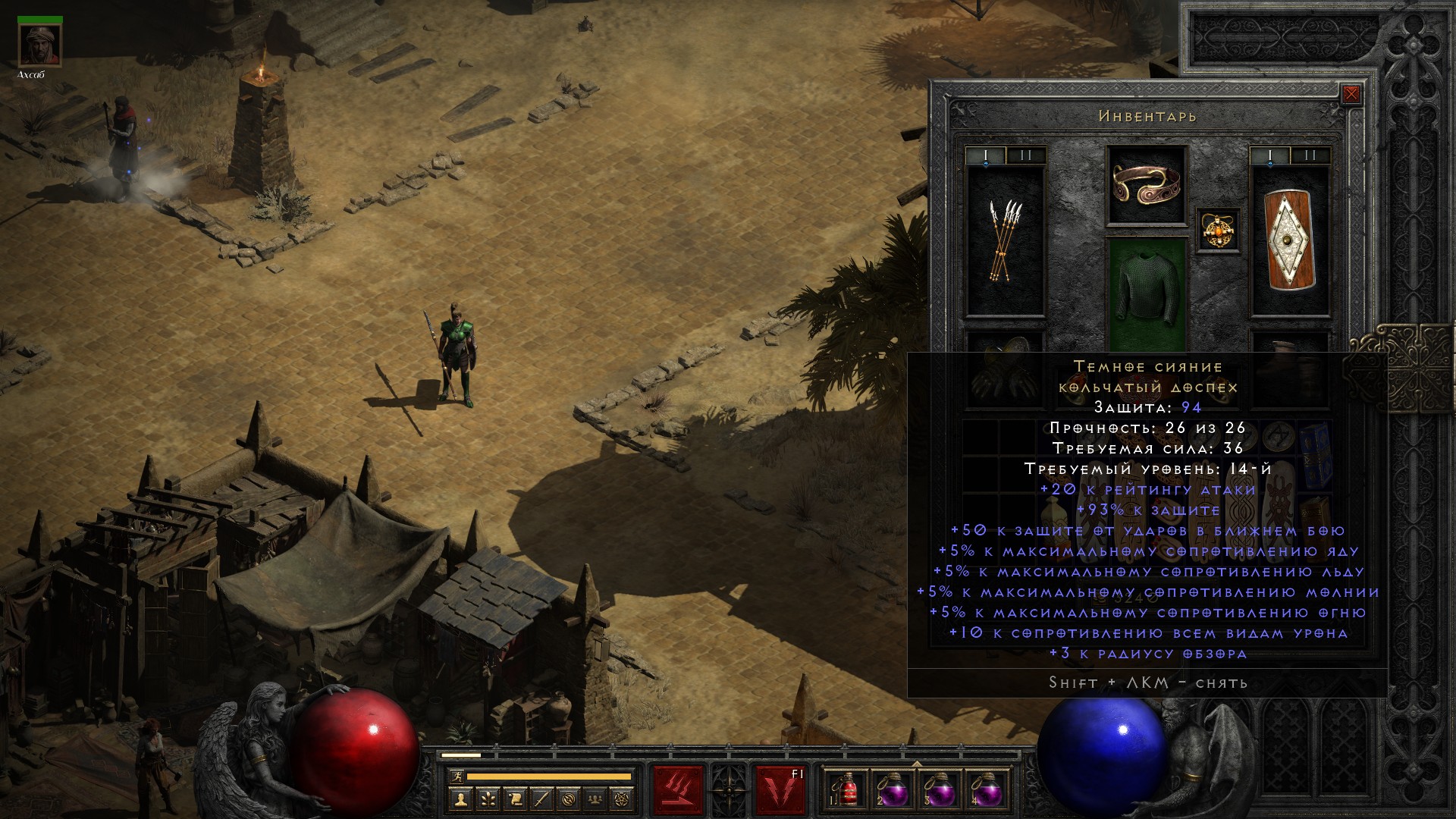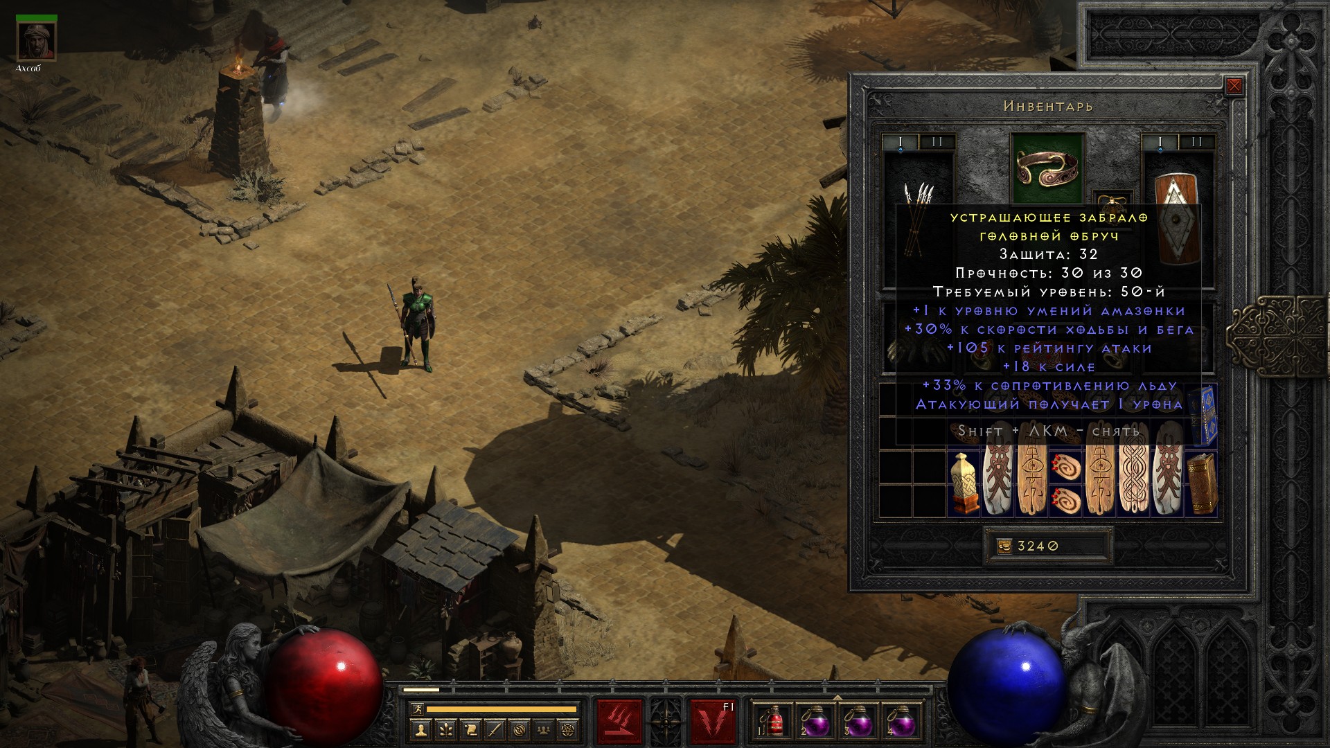 Сопротивления очевидно просели (на сложности Nightmare они получают штраф в -40%), идея что делать приходит сразу – возвращать щит с тремя превосходными алмазами.