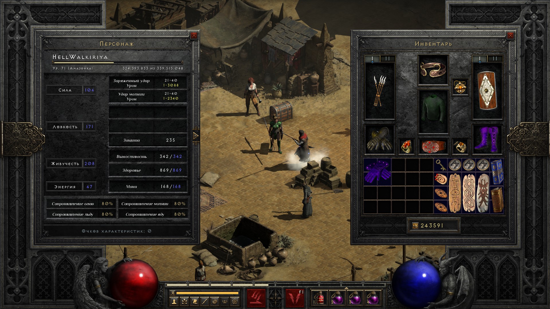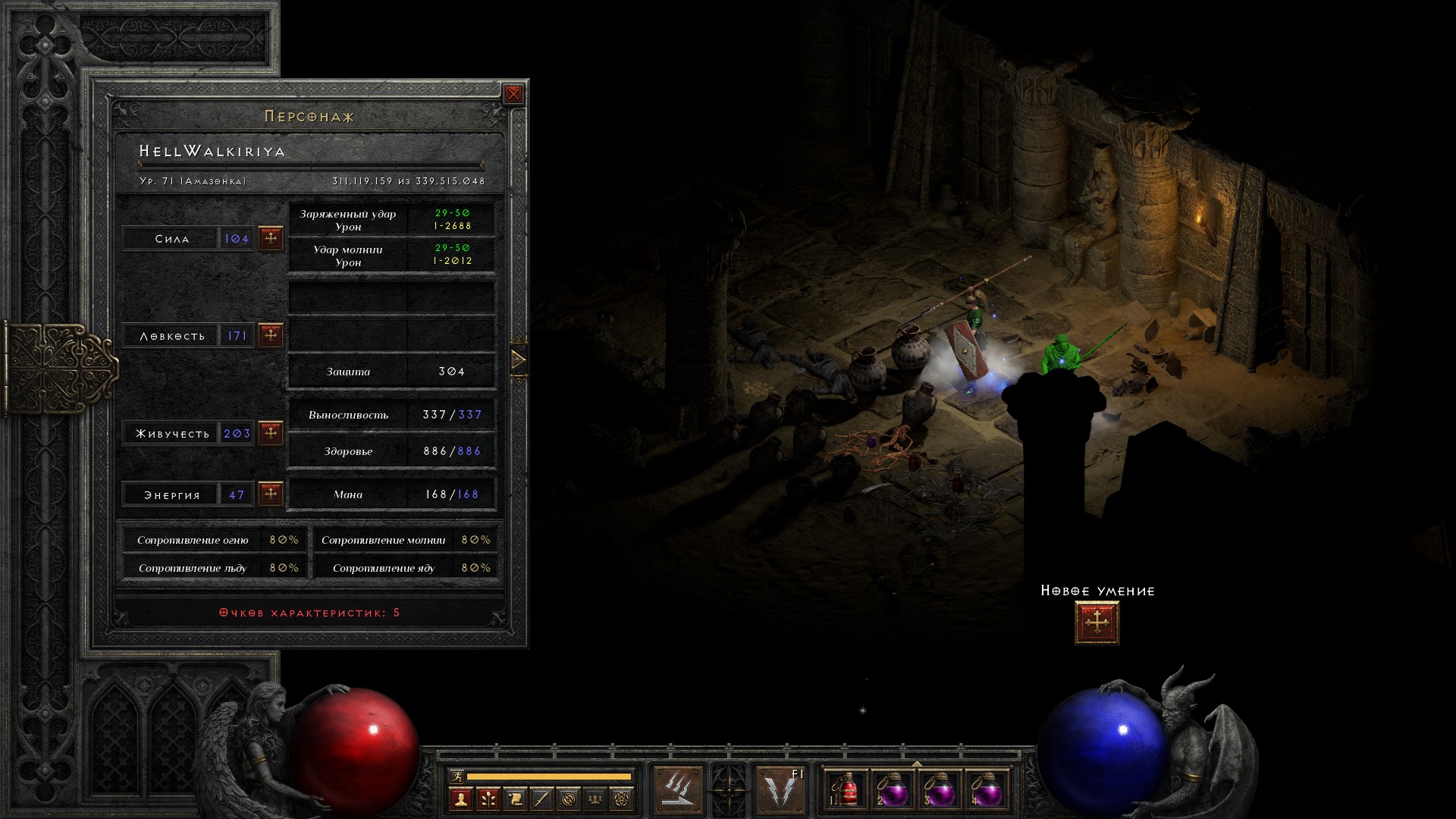 Вернулся обратно на вторую сложность, надел боевую экипировку, добавил талисманов на сопротивления — и пожалуйста, 80% все сопротивления и 75% блока. Ну и еще огромный урон и запас здоровья в довесок.