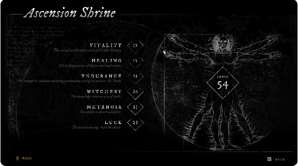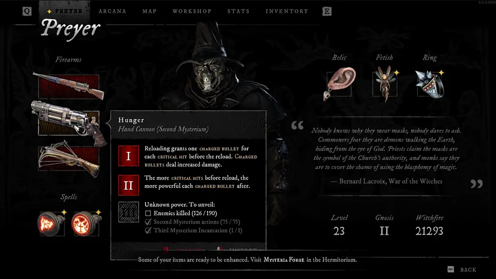 Кроме того, можно отыскать или создать реликвию, фетиш и кольцо, которые дополнят арсенал способностей и навыков. Основной валютой игры, которая требуется практически для всего – прокачки уровней и навыков, исследования оружия и магии, а также для повышения специальной способности Гнозис, являются души. Способность Гнозис позволяет отыскать скрытые сундуки и тайные проходы, не видимые простым взором.