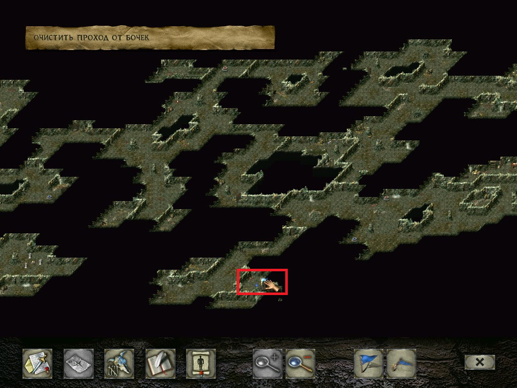 В игре комната подземелья с бочками выглядит вот так, как на картинке выше. И продвинуться предстоит вправо. Чтобы перемещать бочки подойдите к ним вплотную, наведите курсор мышки на бочку, и зажав левую кнопку перемещайте ее как можно дальше влево, затем отпускайте клавишу и бочка переместится если нет препятствий. И так повторяйте со всеми бочками, пока не разблокируете проход направо. Не бойтесь завалить бочками себе проход назад, другого выбора нет, потом откопаетесь.