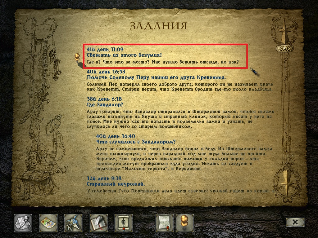 Иконка дневника уже светится красным-задание получено. Попытка открыть любую дверь перемещает вас в другую часть дома, так что выйти наружу можно не пытаться. Зато можно пособирать еду, зелья и прочий хлам, если сможете все унести. Слава богу, игра дает подсказку, как только вы приблизитесь к скелету, прикованному цепями.