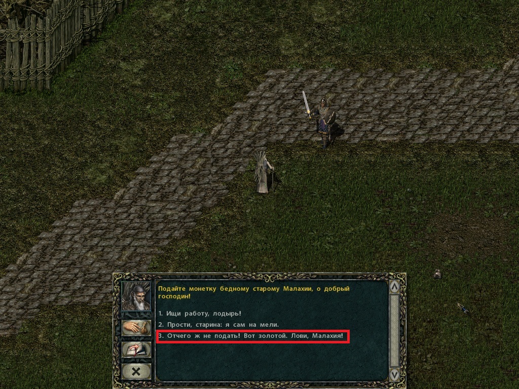 Это задание можно получить, при условии, что встретив нищего старца попрошайку Малахия, вы выберете вариант – подать ему золотой. Иначе это задание вы не получите. Однако, можно снова начать диалог и все же подать старцу, если даже вы уже ему отказали. Между прочим: проверьте чем торгует этот нищий попрошайка, иногда у него есть на продажу оружие или элемент доспеха, зелья и если очень повезет даже книга навыков!