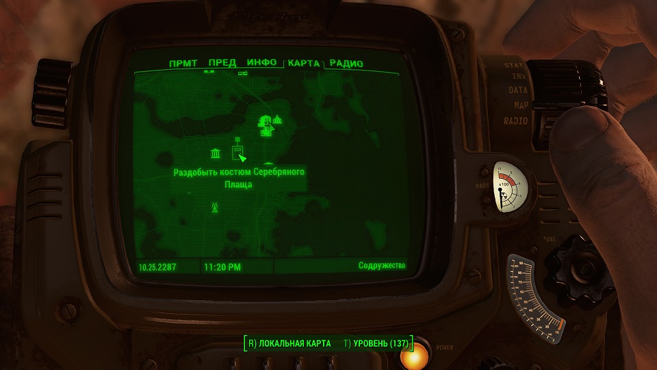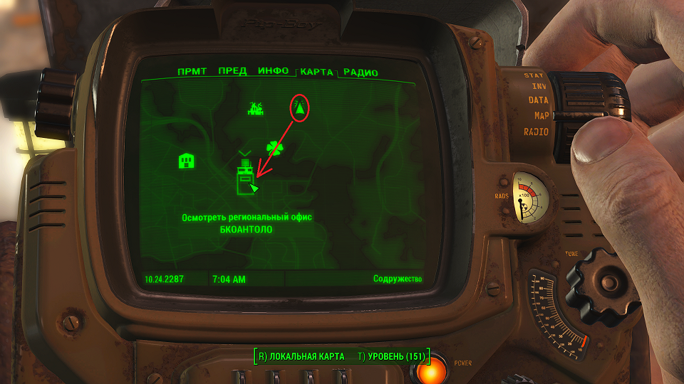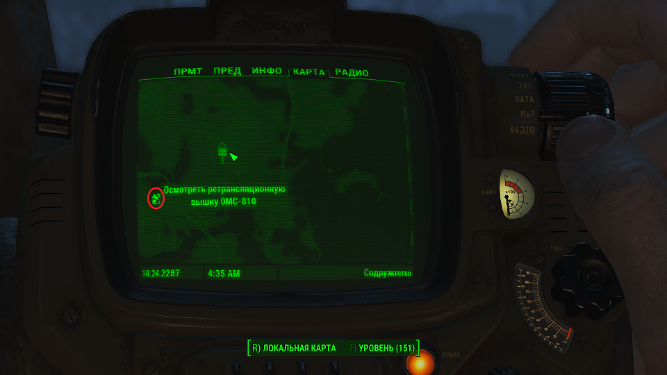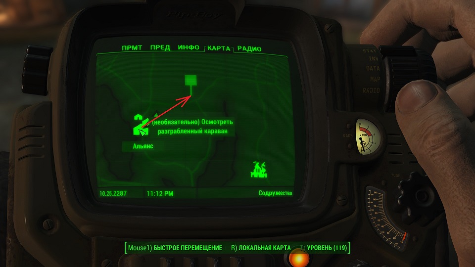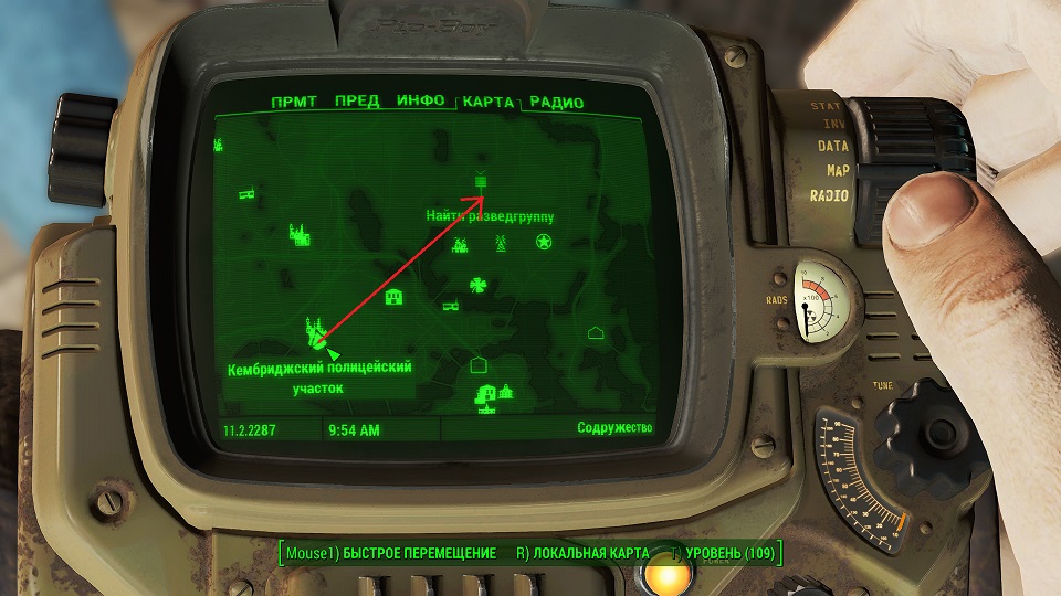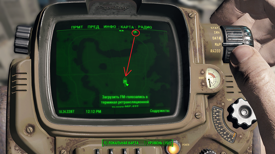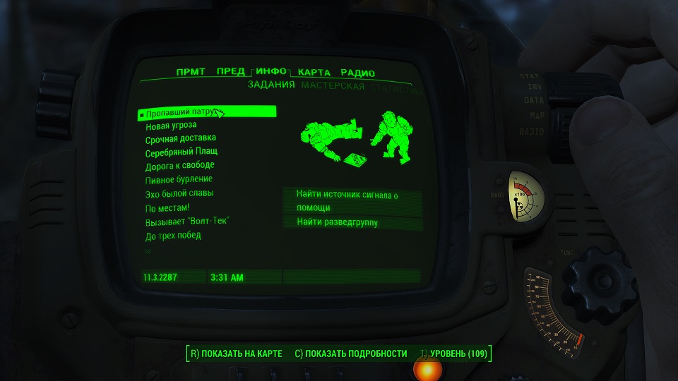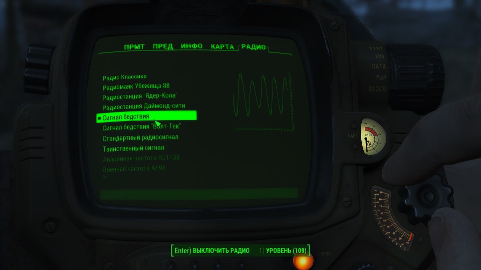 Все что остается, нажав «Таб» перейти в «ПИП-Бой» и там на вкладке «Радио» включить волну «Сигнал бедствия». Далее ориентируемся по усилению сигнала, в каком направлении идти.