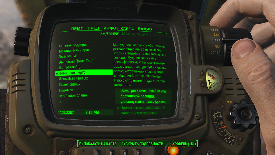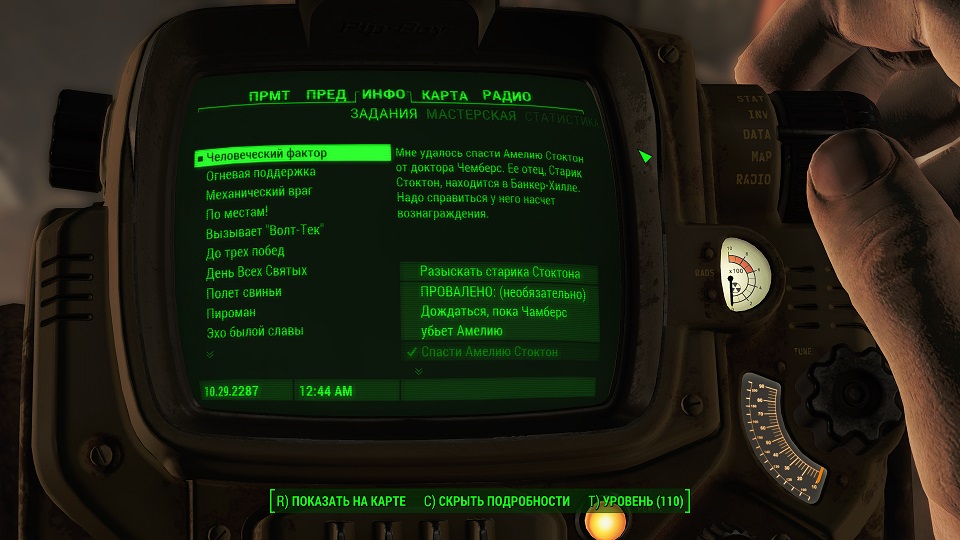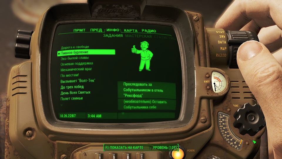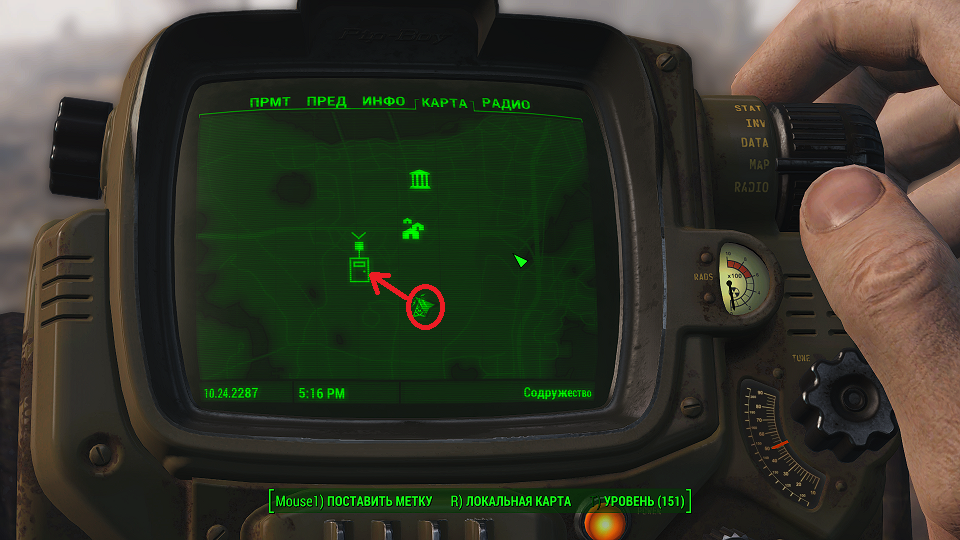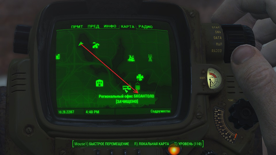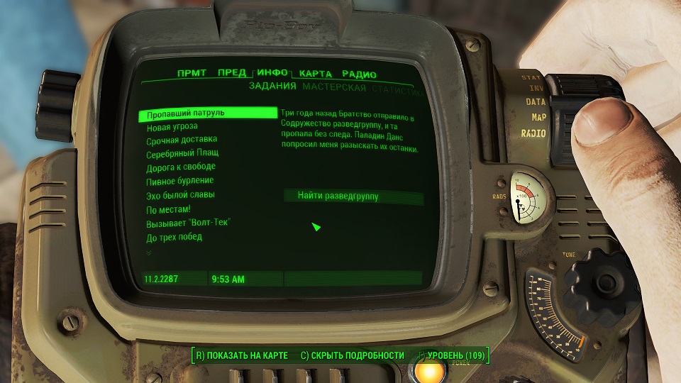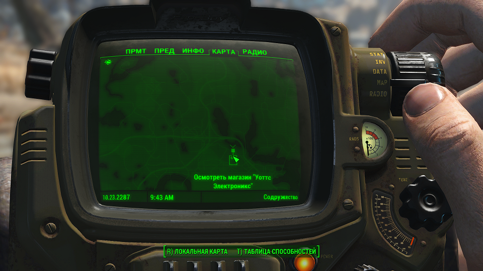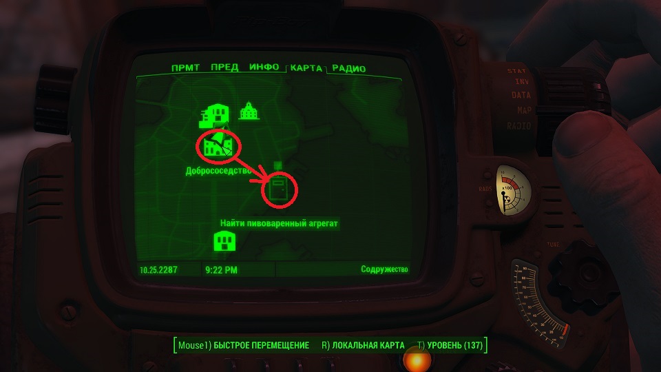 Все что остается, нажав «Таб» перейти в «ПИП-Бой» и там на вкладке «Радио» включить волну «Сигнал бедствия». Далее ориентируемся по усилению сигнала, в каком направлении идти.