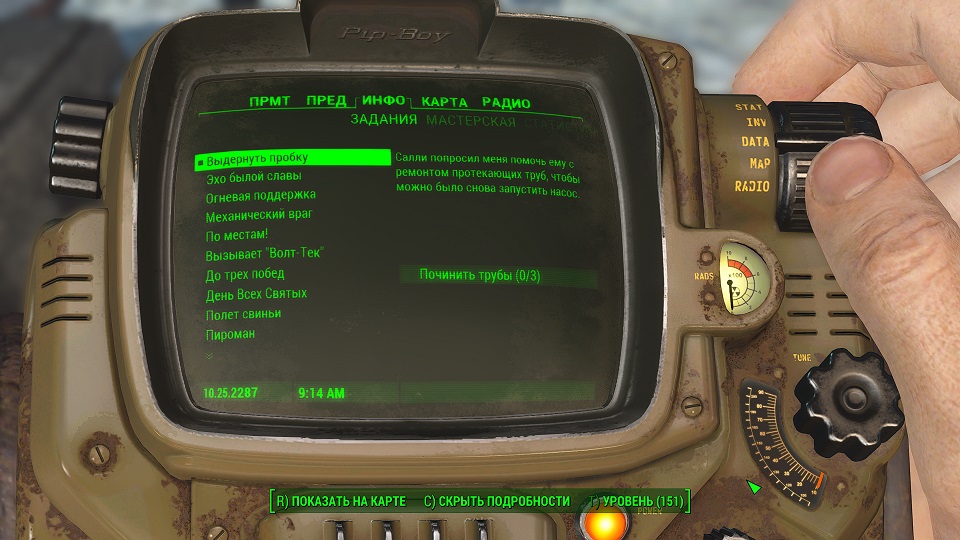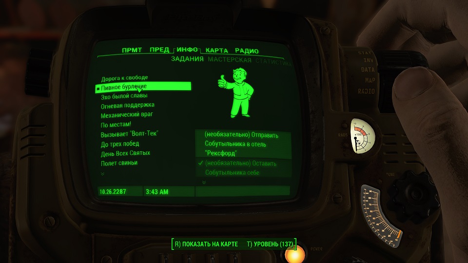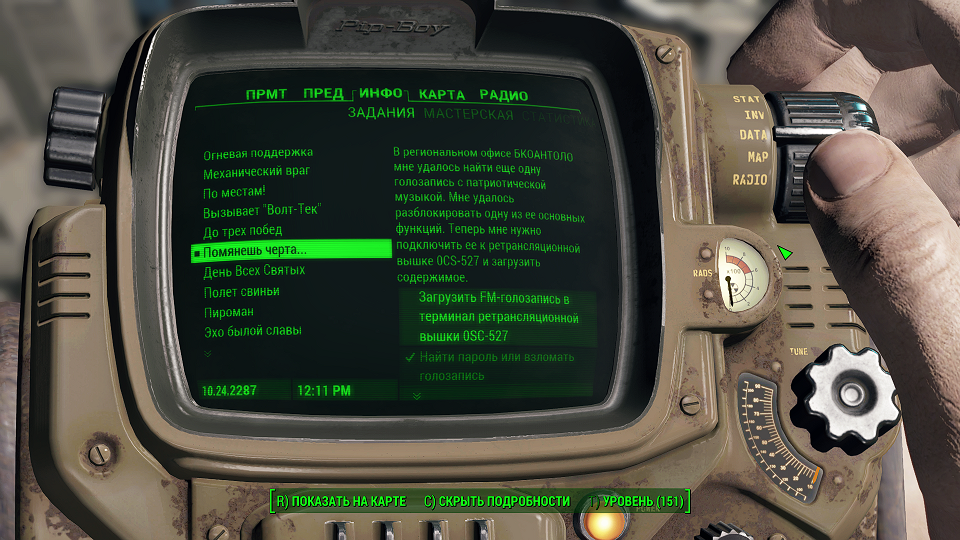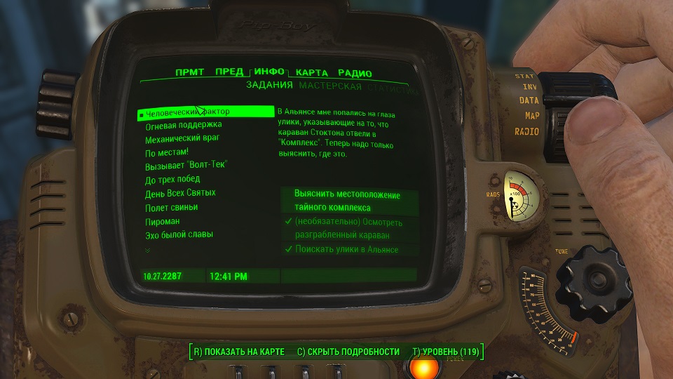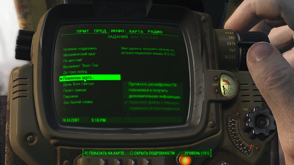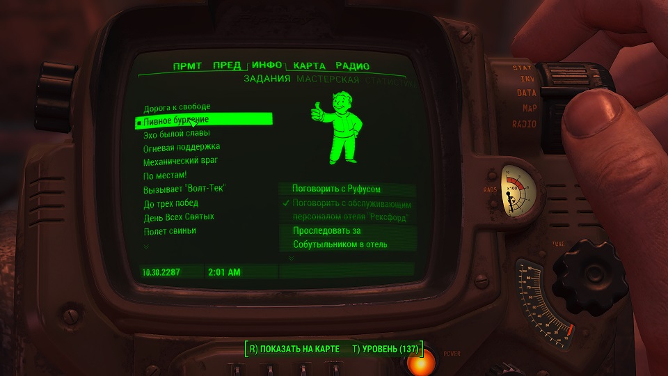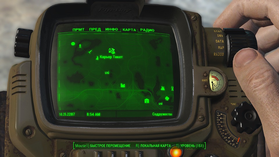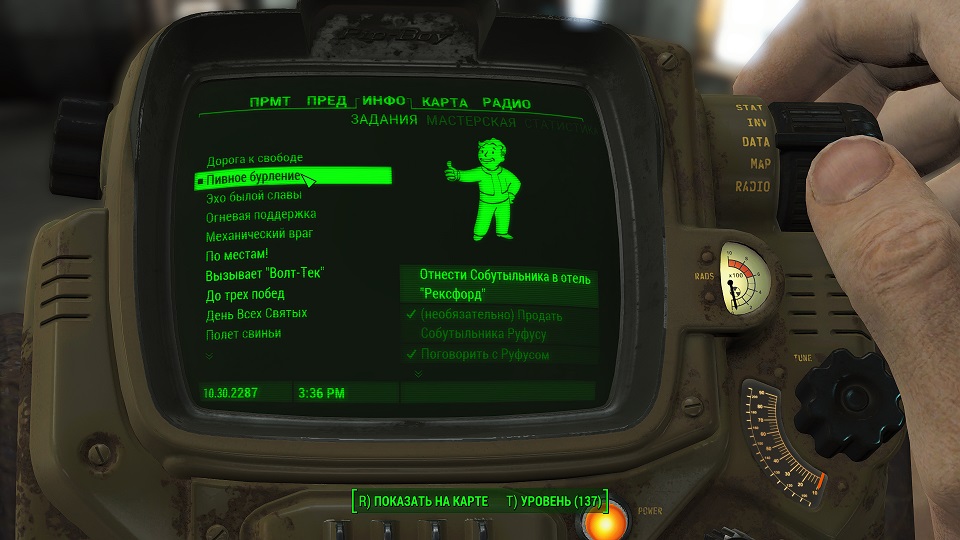 Все что остается, нажав «Таб» перейти в «ПИП-Бой» и там на вкладке «Радио» включить волну «Сигнал бедствия». Далее ориентируемся по усилению сигнала, в каком направлении идти.