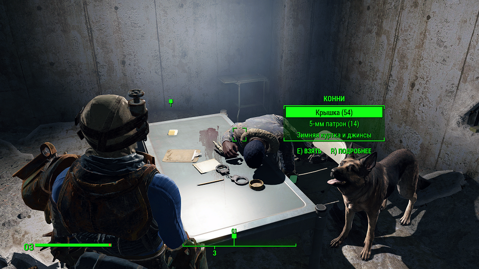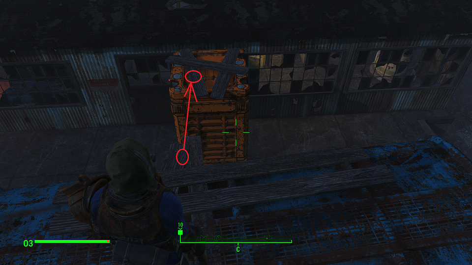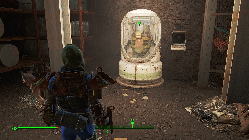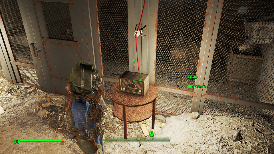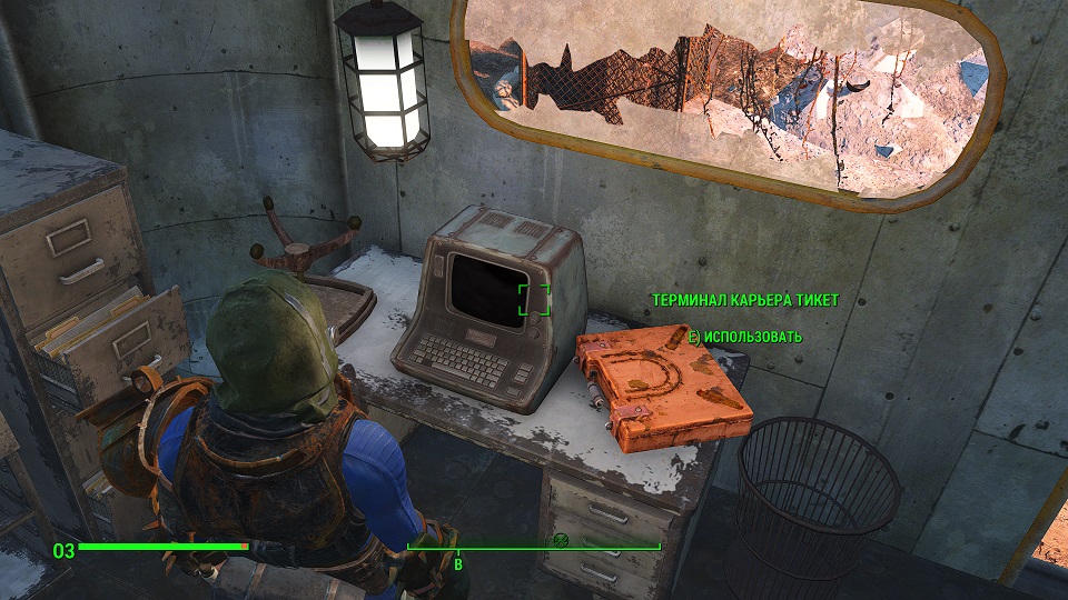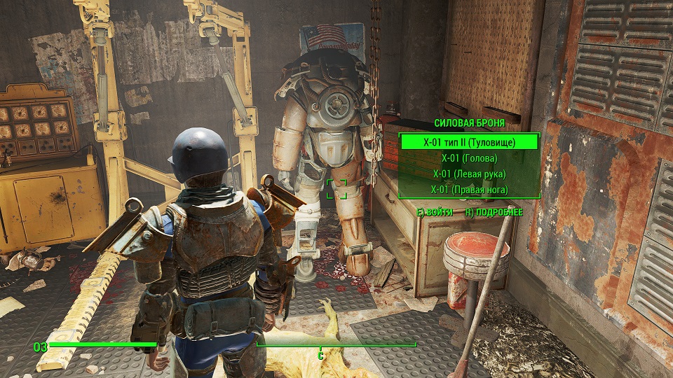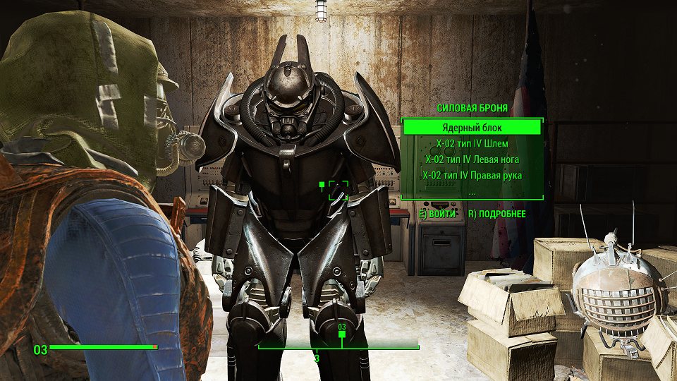 Когда сверху грозы нет, уже полегче. Первым что советую посетить – оружейный склад, правда потребуется навык взлома и хакерства. Что можно компенсировать нужным компаньоном. Помимо патронов и прочих полезных вещей, там стоит «Силовая броня Х-01», только без правой руки и левой ноги. И ядерного блока нет. Вдобавок, подойдя к станции обслуживания брони, нажмите «Е» и заберите оттуда все что считаете полезным. А нажав «Т» можно свалить туда весь хлам.