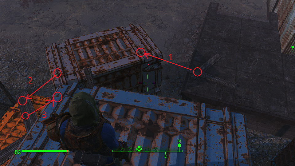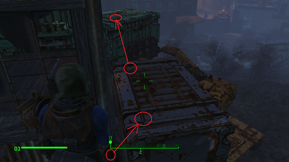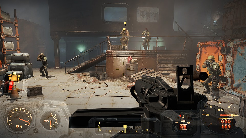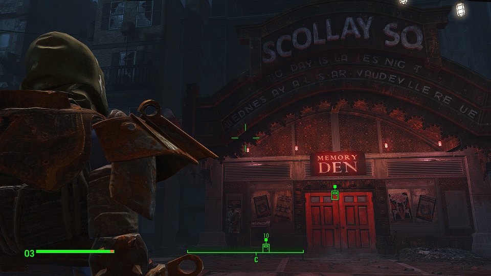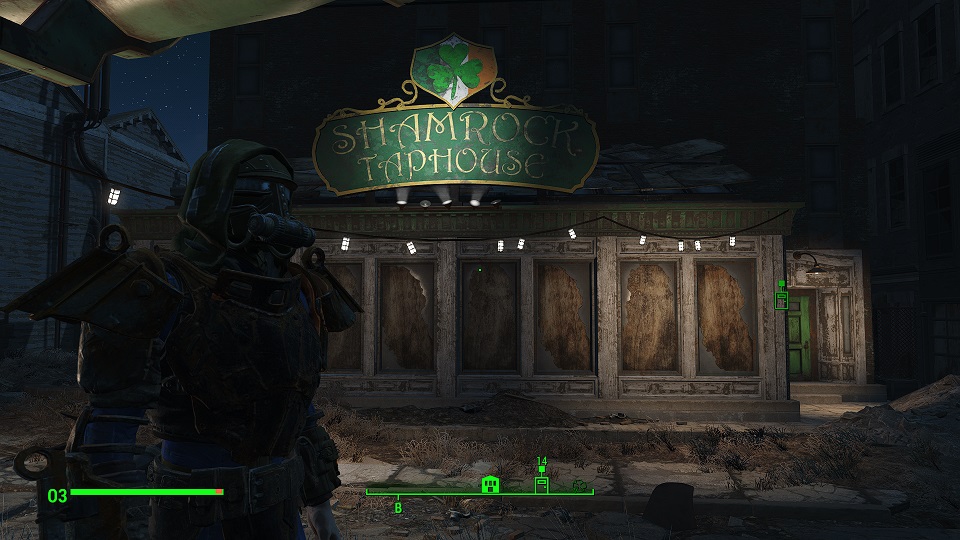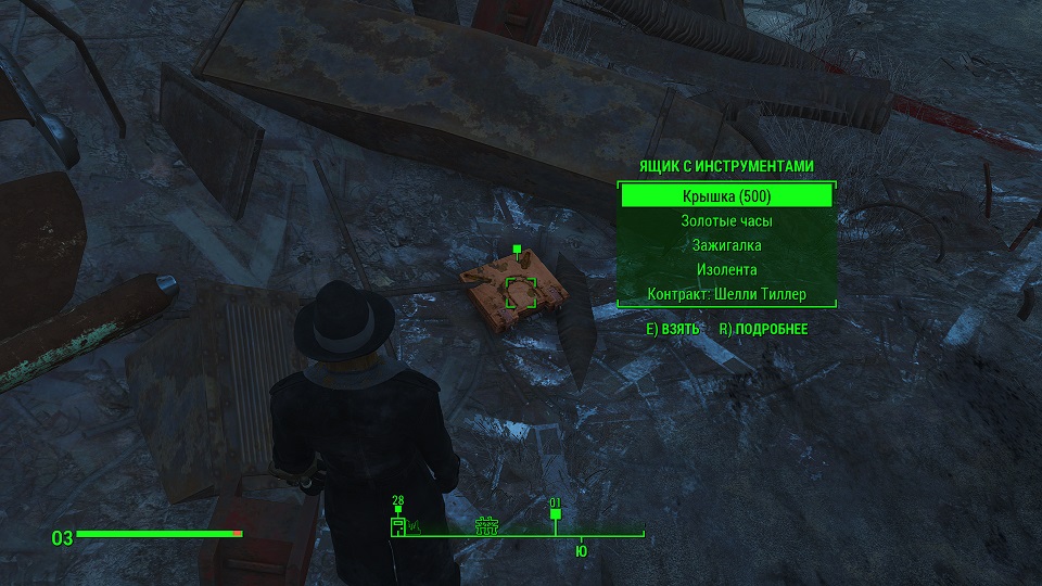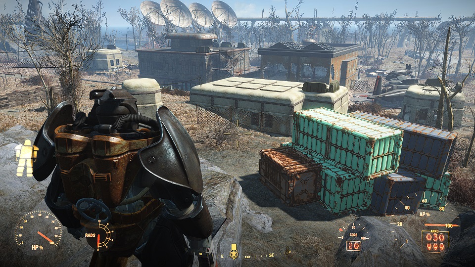 Когда сверху грозы нет, уже полегче. Первым что советую посетить – оружейный склад, правда потребуется навык взлома и хакерства. Что можно компенсировать нужным компаньоном. Помимо патронов и прочих полезных вещей, там стоит «Силовая броня Х-01», только без правой руки и левой ноги. И ядерного блока нет. Вдобавок, подойдя к станции обслуживания брони, нажмите «Е» и заберите оттуда все что считаете полезным. А нажав «Т» можно свалить туда весь хлам.