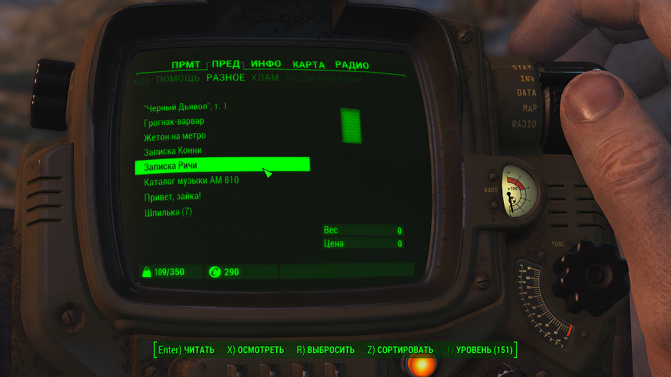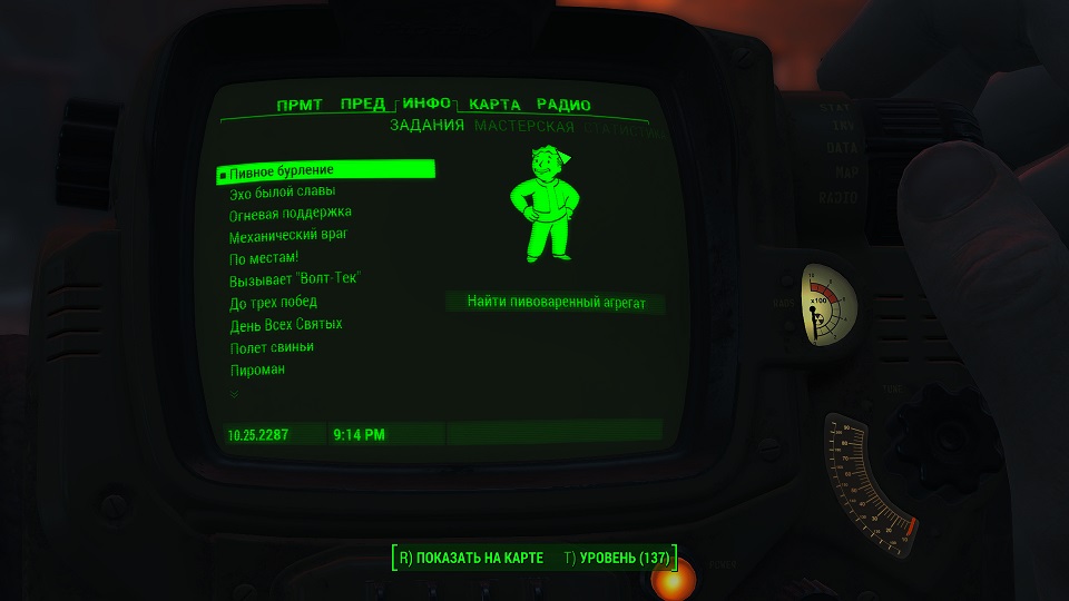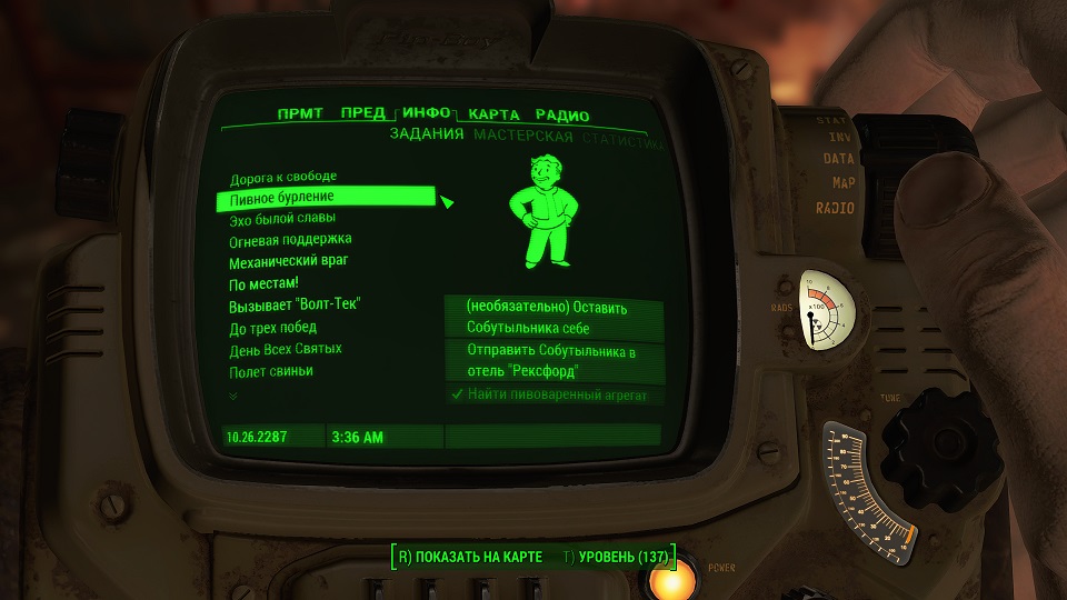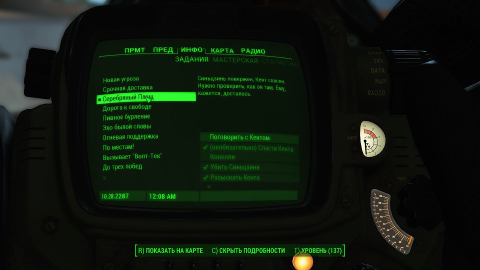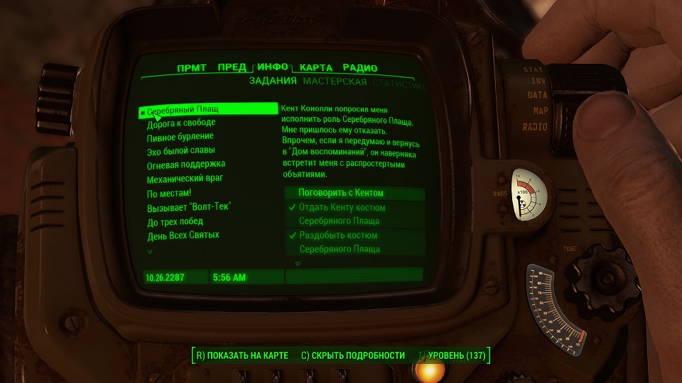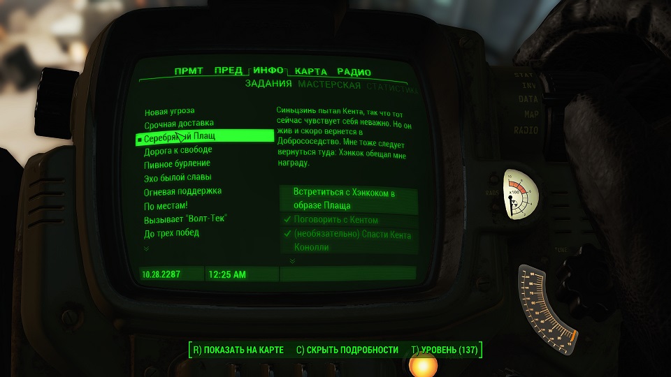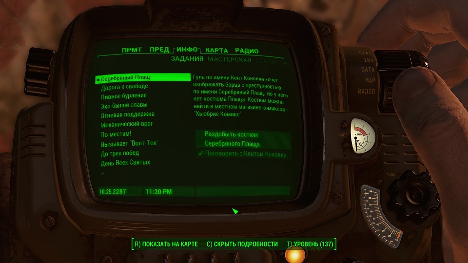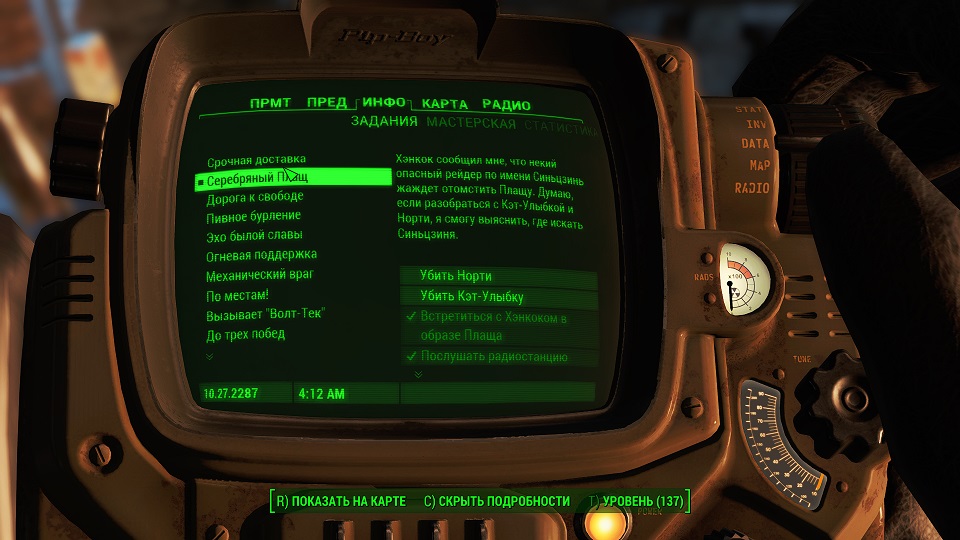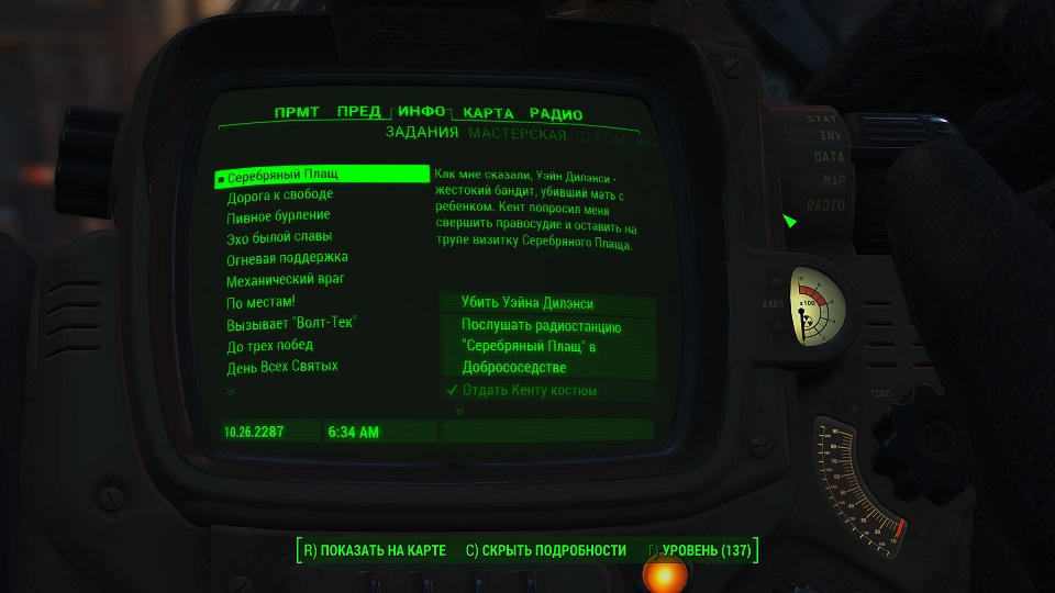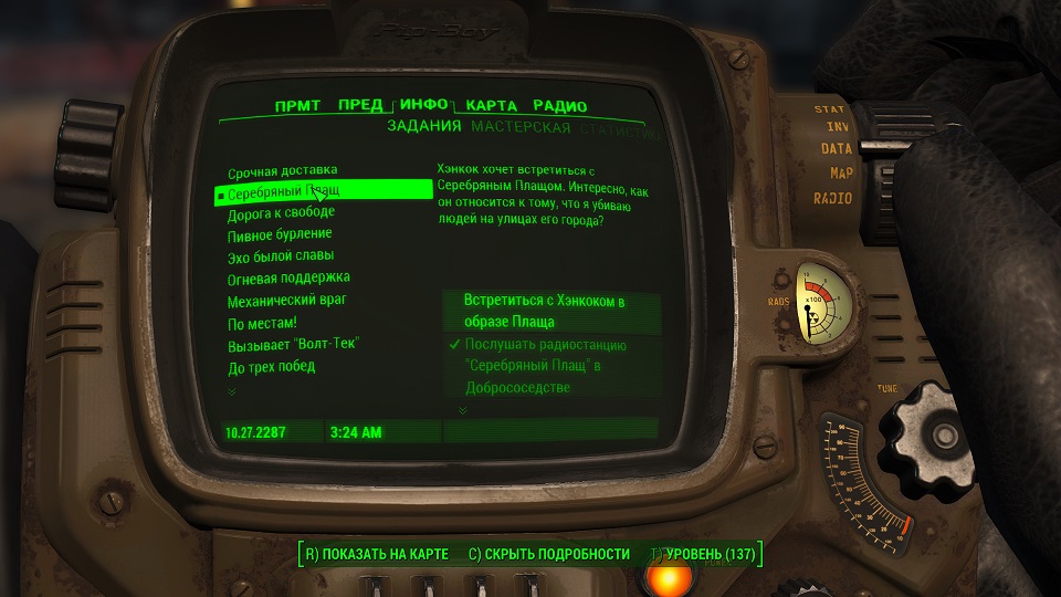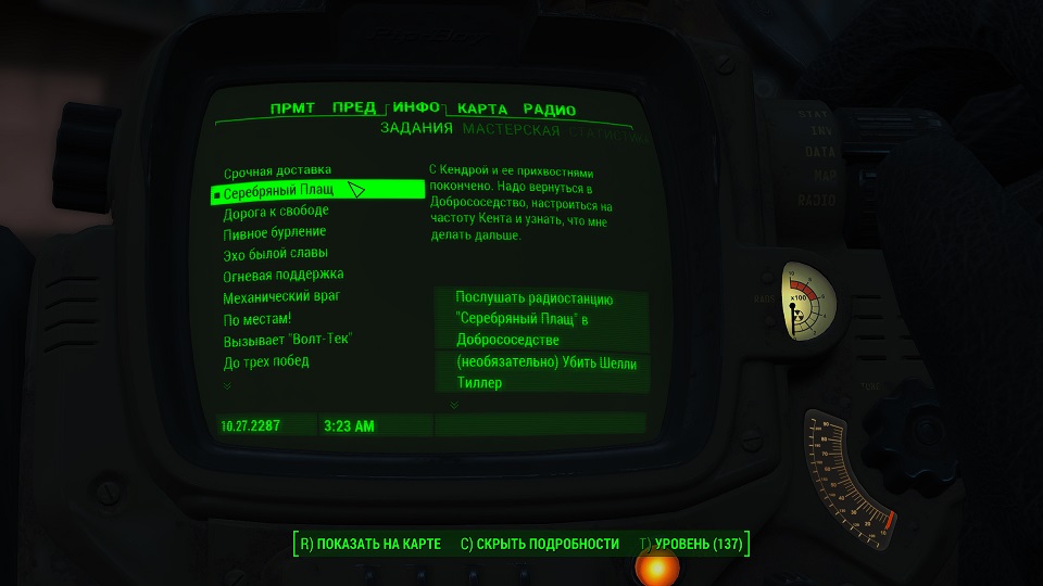 Кроме 500 крышек еще немного полезных и не очень вещей. Опыта не дают, задание выполнено. Перемещаемся в «добрососедство» и снова слушаем радио серебряного плаща. Задание изменилось.