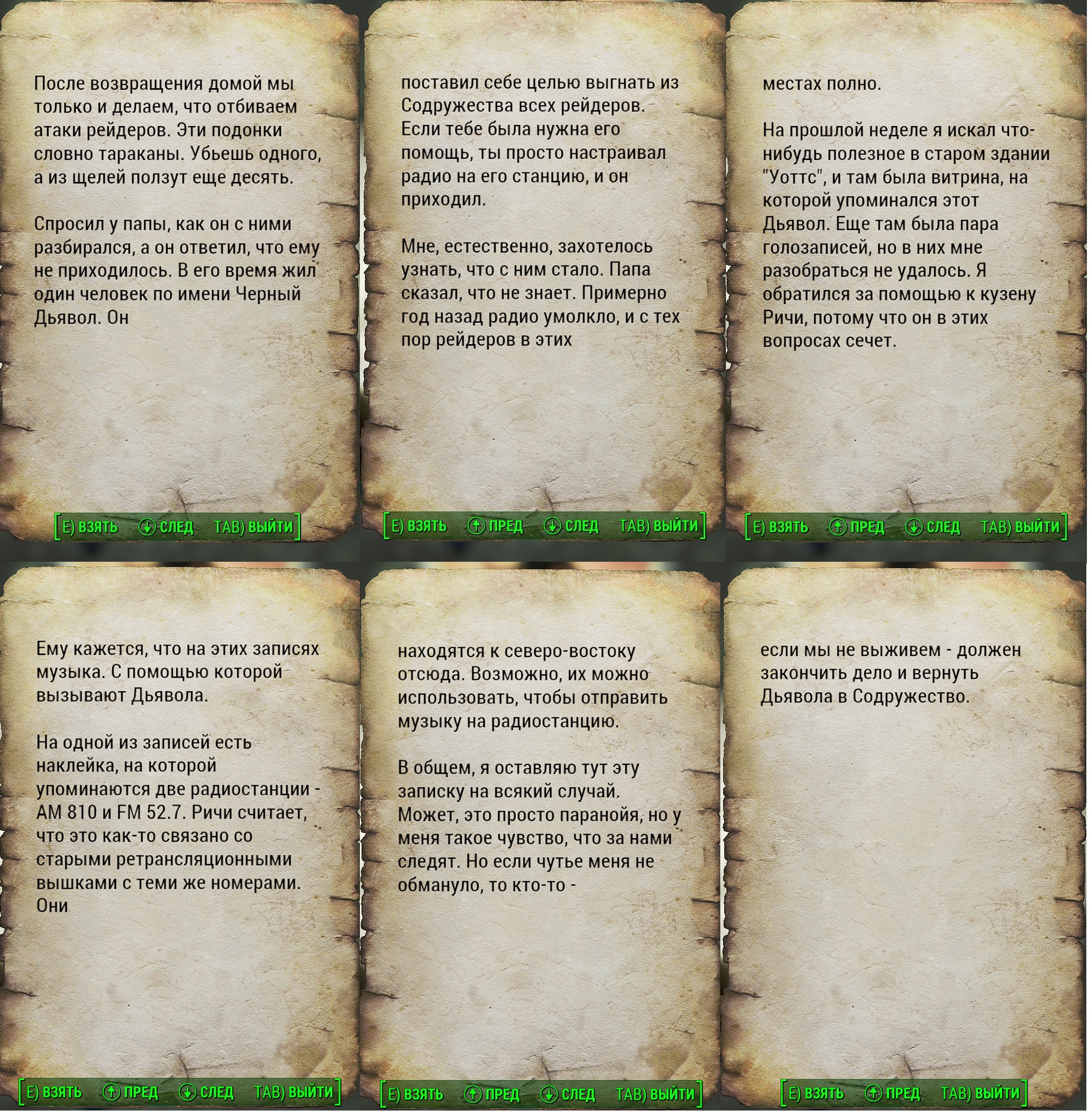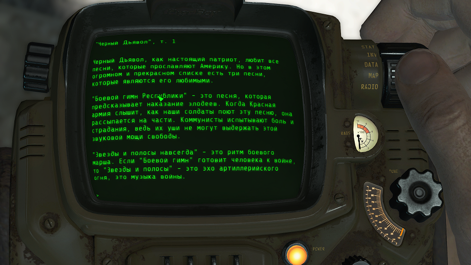 Предыдущие два задания завершены, а новое – «Прослушать голозапись с поля боя». Для этого открываем «ПИП-Бой» нажатием клавиши «Таб» и в разделе ПРЕД/Разное находим голозапись и прослушиваем ее, кликнув левой клавишей мышки. Из записи стало ясно, что патруль «Братства Стали» столкнулся с врагом в пять раз, превосходящим их по силам, а заряды ядерных блоков в броне у всех почти закончились. Нет, это не было массовое самоубийство, как может показаться, было принято решение сжечь брони, чтобы не достались врагам и отступить к «Тренировочной площадке Национальной гвардии». Спаслись трое, а погибший рыцарь похоже прикрывал отход и совершил подрыв. Остается забрать и прослушать голозапись, как это делать вы уже знаете. Из записи узнаем, что двое отправились к спутниковой станции тут неподалеку, и вестей от них нет. Эстлин оставили тут держать позицию, но врагов было слишком много. Теперь у нас задание «Осмотреть спутниковую станцию». Примечание: если вы нашли поле битвы до получения этого задания, то оно начнется с этого этапа.