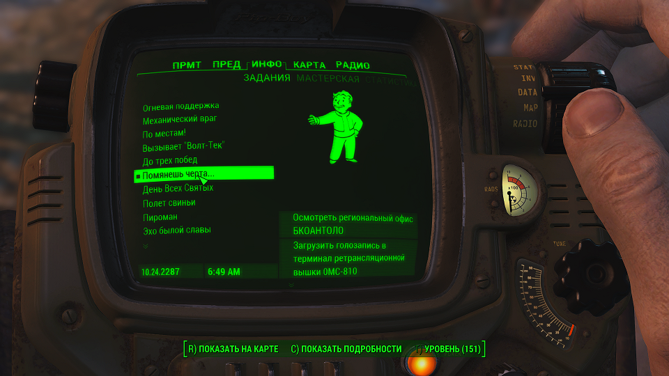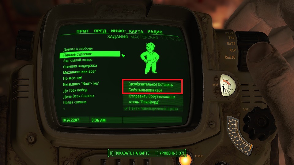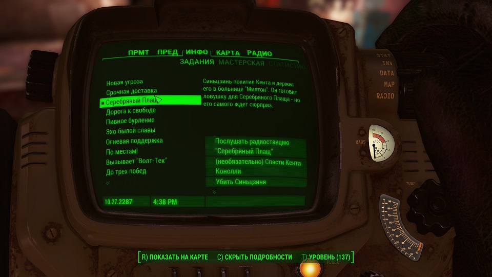 Теперь нужно убить наркодилера, продающего наркотики детям. В диалоге с дилером можно получить взятку крышками и даже потребовать прибавку. Можно получить 50, 75 или 200 крышек, насколько позволит ваш уровень харизмы. При этом напарник Хэнкок не одобрит взятие взятки, и его к вам отношение ухудшится, а Макриди такое поведение одобрит, как и убийство Эй-Джея. В задании же было разобраться, будем считать, что мы ему пригрозили и он все понял. Или же поступим как супергерой – казнить, нельзя помиловать. Не зависимо от вашего выбора снова слушаем радио.