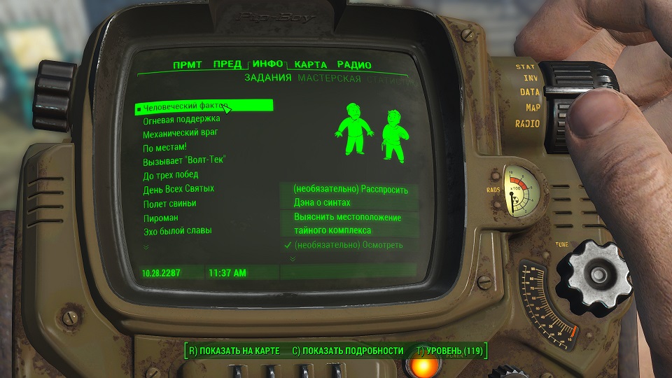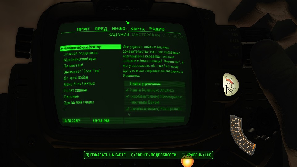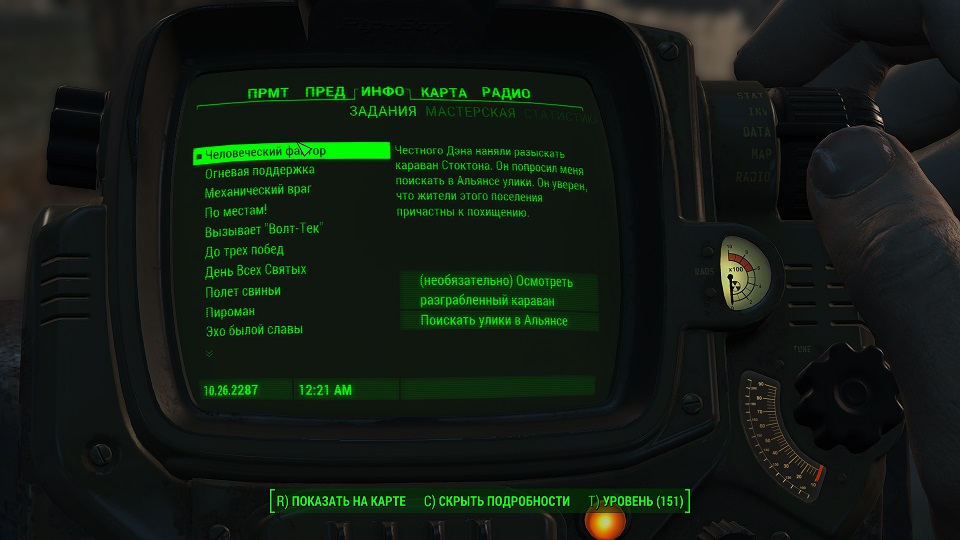 3) Если принять «Виноградные ментаты» перед сдачей задания Дэну, он может стать враждебным, как будто мы убили Амелию, и сама Амелия тоже станет враждебной; 4) «Комплекс» никак не отмечен на карте не до не после его обнаружения; 5) Дверь магазина в «Альянсе» оказалась заперта. Что не дает ни найти записку ни поговорить с продавщицей, так как продавщица за прилавком. Тут либо взлом, либо украсть ключ и открыть. 6) При обыске разграбленного Каравана улика Лимонад Дизера отсутствует или его нельзя взять. Заставьте компаньона обыскать охладитель или попробуйте сохранившись, выйти из игры и зайти снова. 7) Если не брать с собой Дэна, убедить охрану в диалоге, но не приближаться к доктору Чамберс и не говорить с ней, а пообщаться с Амелией, то можно отправиться к старику Стоктону и поучить вознаграждение за спасение. При этом «Комплекс и «Альянс» останутся к вам нейтральными; 8) Охранник «Альянса» Соунсон, у которого проходили тест, может стать бессмертным если вы спасли Амелию, и теперь «Альянс» против вас. Исправить можно сбежав, по карте быстро сменив локацию, а потом вернуться – и убить. 9) При выполнении задания «Ночной Бостон» старик Стоктон умер – это баг. При этом, когда задание «Человеческий Фактор» достигнет стадии «Разыскать Старика Стоктона», оно автоматически будет провалено. Чтобы получить награду, выберите концовку без Стоктона. 10) Стоктон ведет себя так, как будто вы к заданию никакого отношения не имеете. Возможно, стоит выждать и пообщаться с ним днем, я заметил, что ночью не все персонажи разговаривают о задании или загрузиться и выбрать концовку без его участия; 11) Можно сделать поселение «Анклав» дружественным не истребляя поселенцев, и даже присоединить его к «Минитменам», и Амелия при этом будет спасена. Для этого открываете консоль буквой «Ё» и пишете там resetquest 22a08, закрываете и снова открываете. Набираете setstage 22a08 740 после чего следует поговорить с Джейкобом Орденом, о присоединении к «Минитменам». После чего следует подойти к мастерской и активировать кнопкой «Е» - взаимодействие. Теперь наберите в консоли resetquest 22a08, закройте консоль и снова откройте. Наберите setstage 22a08 720 и дело сделано. 12) Если предметы в ящиках, коробках прочих контейнерах и сами контейнеры в «Альянсе» остались красными, и их взятие рассматривается как кража — это баг. Тогда следует либо разобрать контейнеры, в которых они лежат при помощи мастерской, а предметы потом взять из мастерской – туда они переместятся. Либо приказать собаке обыскать их, но содержимое при этом может пропасть. Можно выбрать любой предмет, в том числе лежащий открыто, затем открыв консоль написать: setownership, чтобы он стал зеленым и взятие уже не будет воровством.