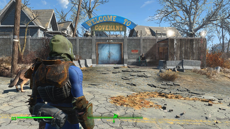Ориентируясь от стартовой области «Убежище 111» по карте — это еще не так далеко. Выглядит поселение следующим образом: «Добро пожаловать в Альянс» - только он окружен высоким забором с пулеметными турелями.