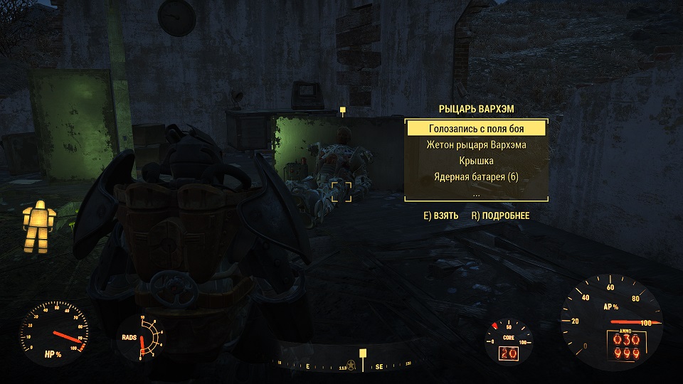 Двигаясь по сигналу, увидите разваленное обгорелое здание, при приближении к которому сигнал усиливается, а внутри воронка с повышенной радиацией, расплавленные силовые брони и труп Рыцаря Вархэма. Точка задания на нем, как только поднимите «Голозапись с поля боя», задание меняется. Примечание: можно выключить«Сигнал бедствия», теперь он бесполезен и только создает посторонний шум.