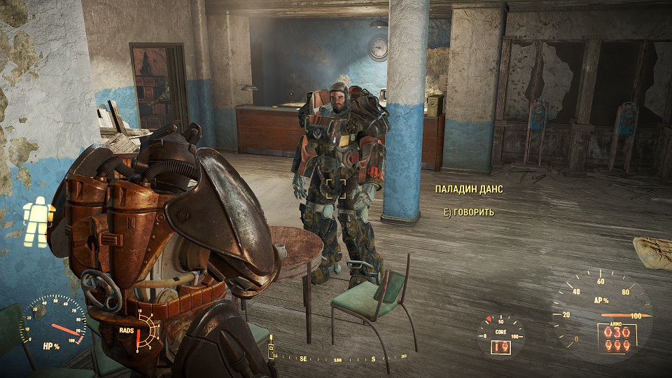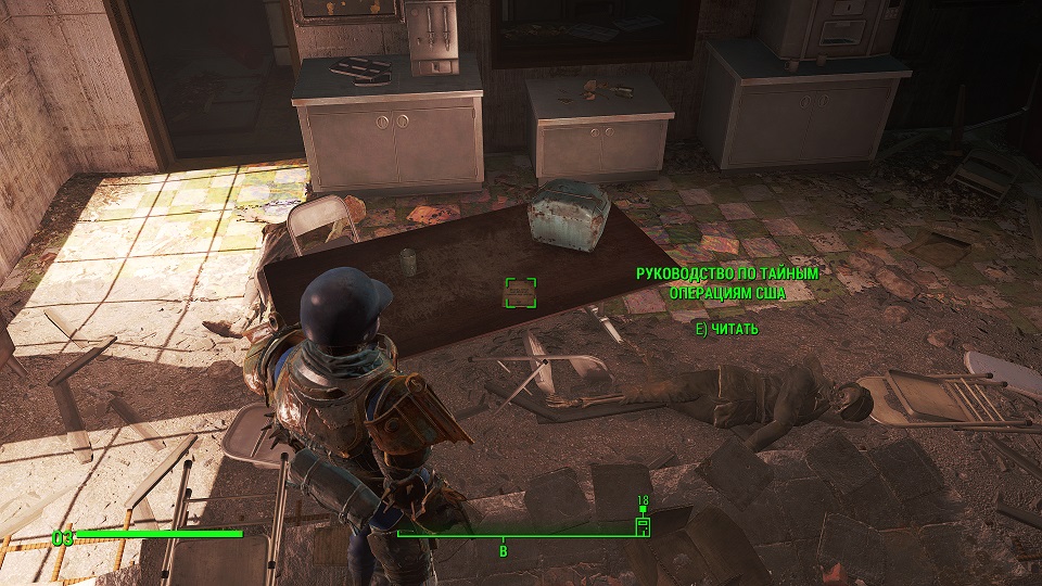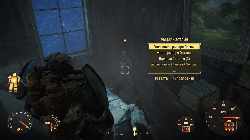 Совет: если вы сами уже в силовой броне, то можете попросить компаньона надеть силовую броню! Гуль, человек или Синт это смогут. Убиваете двух зайцев - и напарник в силовой броне и делать еще одну ходку чтобы забрать ее не нужно. Далее заходим в главное здание и там на первом этаже находим труп Рыцаря Эстлин.