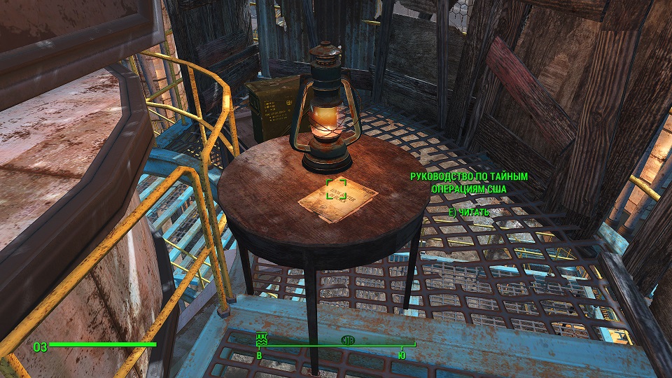 Подобрав все, что вам пригодится, получаем задание «Прослушать голозапись скриптора Фариса». Из записи узнаем, что Фарис тяжело ранен и умирает от кровопотери, последний из группы паладин отправился в бункер и два часа его нет. Фарис надеется, что тот успеет помочь Эстлин, но как мы уже знаем, ей никто не помог. Обыщите все вышки подвешенные тюки на предмет полезностей, на одной вышке около лампы лежит журнал «Руководство по тайным операциям США». Примечание если вы еще не получили это задание, тогда оно начнется с нахождением тела Скриптора Фариса