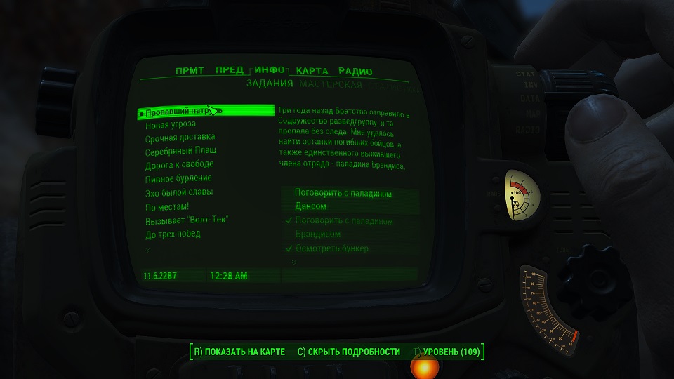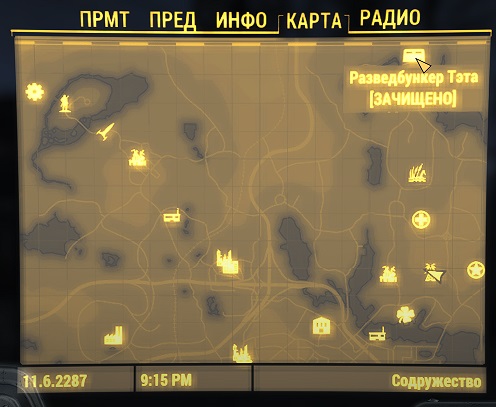 Теперь у нас задание – «Осмотреть бункер», на карте мы его видим, отправляемся узнать, что случилось с последним из разведотряда паладином.Примечание:если вы отыскали этот бункер и взломали до того, как получили это задание, оно начнется с этого этапа.
