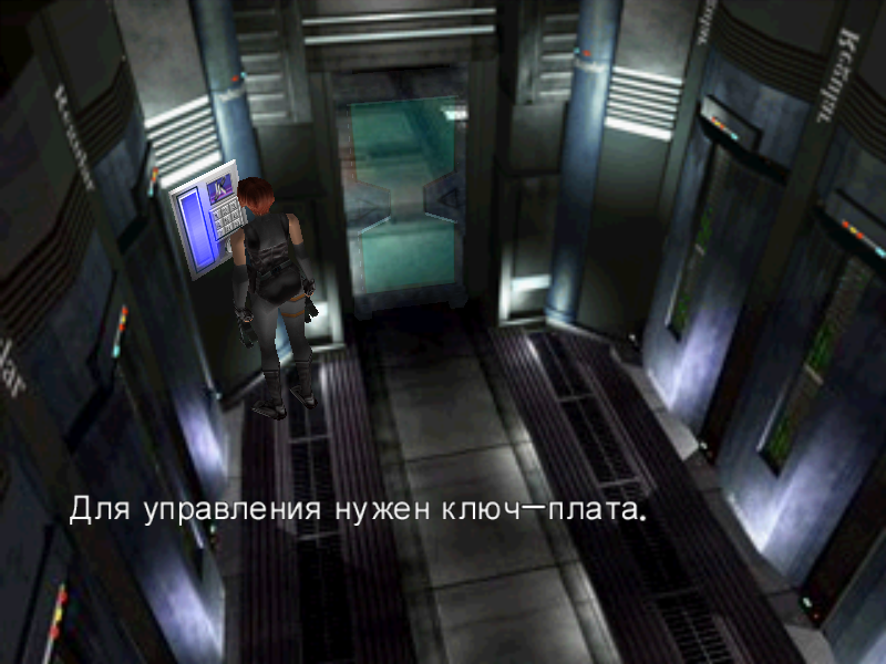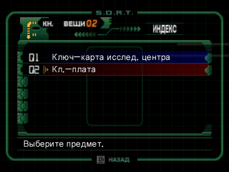 Внимательные игроки заметили, каким цветом светилась панель перед заблокированной дверью – СИНИЙ. Значит нам необходимо подойти вплотную. Открыть меню вещей, на ПК это кнопка «Z». Затем выбрать подраздел «Вещи», а в нем нижнюю строку. В списке выбираем ключ-плата (Кл.-плата) и жмем дважды на применить, на ПК кнопка «Энтер».