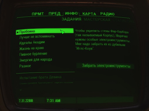 Получить это задание можно от Морячки в поселении Фар-Харбор, при условии, что вы выполнили ее первое задание Пробоина и при этом не накосячили (не убили Майка Мачете, он не погиб от лап Гулей и не продали ему квестовые инструменты).