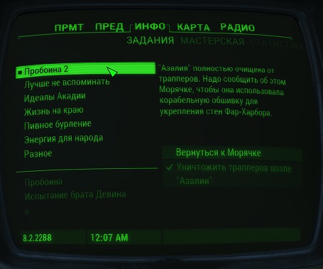 У Морячки новая идея, как еще лучше укрепить оборонительные стены поселка Фар-Харбор. Когда-то давно возле южной окраины острова потонуло грузовое судно Азалия. Разрезав металл корпуса этого судна, можно дополнительно укрепить стены Фар-Харбор. Нужно торопиться, сделать все побыстрее… А спешка вызвана тем, что у Морячки обнаружили смертельное заболевание. Однако есть проблема – судно прибило к берегу и его облюбовали местные бандиты – Трапперы. Вам необходимо зачистить судно от бандитов, чтобы с Фар-Харбора выслали бригаду резчиков и разобрать его обшивку на листы для укрепления стен.