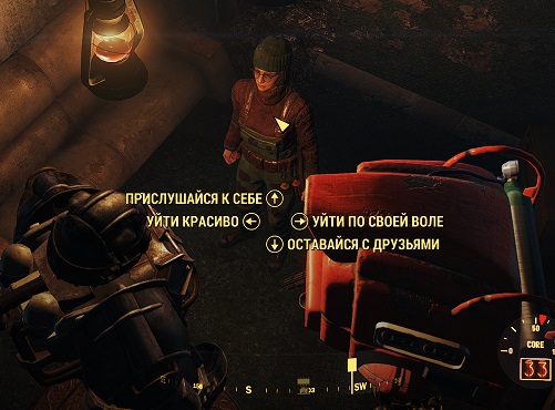 Если выбрать фразу – «Оставайся с друзьями» - она лишь посмеется (похоже нет здесь у нее друзей) и задание после этой фразы не будет завершено, придется пообщаться заново. Фраза – «Уйти по своей воле» - завершит задание, а компаньон «Старик Лонгфелло» - одобрит такой вариант ответа в диалоге. Остальные два варианта просто завершают задание.
