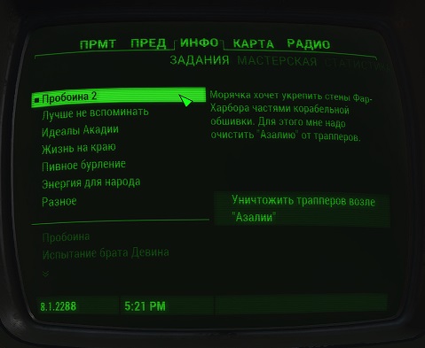 • Различные баги с зависанием этого задания на разных стадиях выполнения можно исправить такими способами: • Узнать на какой стадии задание застряло, набрав в консоли (клавиша «Ё») команду: GetStage 0302039a. После чего переключиться на следующую стадию набрав команду SetStage 0302039a <№ следующей стадии>; • Набрать в консоли CompleteQuest 0302039a – и это задание будет завершено; • Если набрать команду: ResetQuest 0302039a – задание начнется с начала; • Командой ResetQuest 0300AEC4 перезапускается задание «Пробоина 2» если у вас оно завершится ошибкой или подвиснет. • Еще одно решение, которое я не рекомендую, набрать команду: caqs – при этом завершатся все имеющиеся у вас задания, с получением всех предметов, крышек и опыта за них одновременно. Команда может вызвать кучу багов вплоть до завершения игры и перезагрузки устройства.ПРИМЕЧАНИЕ: в консольных командах первые две цифры это номер дополнения скорее всего это 03 (как у меня). Проверьте, если не коды не сработают, тогда открываете консоль, наводите мышку на шкаф (прочий предмет дополнения) и берете две первые цифры из его ID, которое отобразится в консоли.