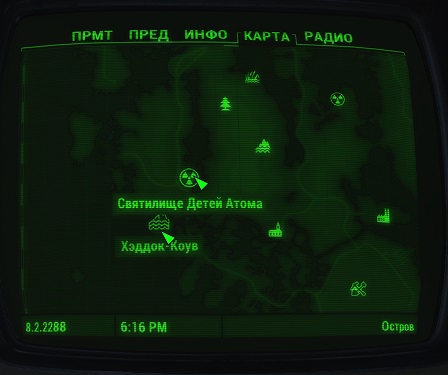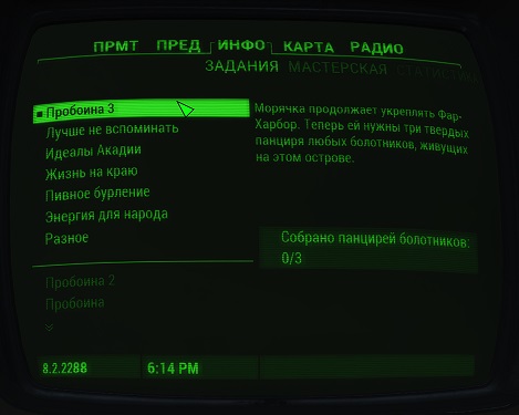 Морячка считает, что оборонительные стены Фар-Харбор достаточно укреплены от обычных монстров. Но вот Матка болотников плюется кислотой – которая способна разъесть даже металлическую защиту. Поэтому она хочет укрепить стены панцирями болотников, которые кислота не разъест. Вам нужно убить болотников и принести Морячке три панциря, этого будет достаточно. Фактически добыть панцири вы можете с любых болотников что вам встретятся, однако на устричной ферме Хэддок – Коув они точно есть. На этот раз придется двигаться по диагонали через весь остров. Примечание: тем, кто выполнил первое задание секты «Дети Атома» - Туманные видения будет легче, так как ферма недалеко от их святилища, а значит доступно быстрое перемещение.