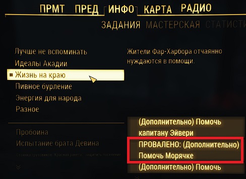 Это задание входит в более крупное «Жизнь на краю», заключающееся в помощи всем нуждающимся жителям поселения Фар-Харбор. Примечание: задание вы получите не сразу после того, как сдали первое, а когда покинете поселение Фар-Харбор, возникнет задание «(Дополнительно) Еще раз помочь морячке». Вернувшись к Морячке и пообщавшись с ней, получите это задание.